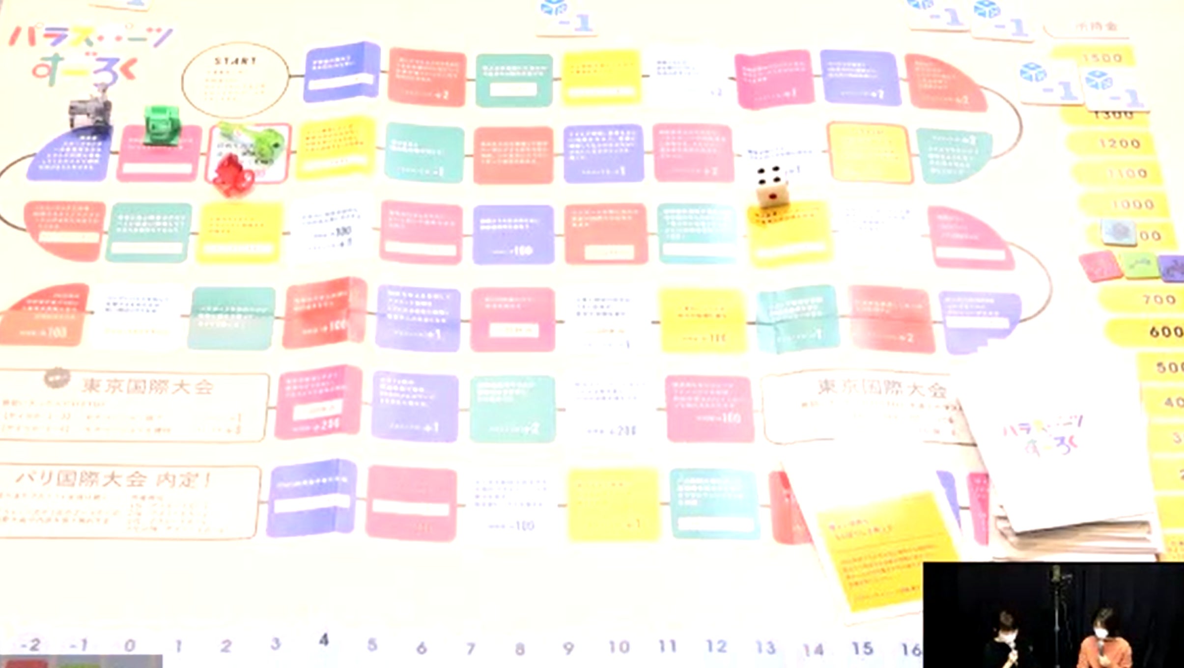 もう一つ、「オンライン収録参加コース」にご支援いただきました前田大様と、笹島選手、体育会の平井・前田で実物のパラスポーツすごろくを画面に映しながらすごろくをプレイ!