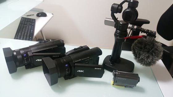 左から、4Kカムのフラッグシップ機『FDR-AX100』、本日発売の後継機『FDR-AX700』、歩き撮りでブレない3軸ジンバル採用の『DJI OSMO』、完全防水仕様のアクションカム『HDR-AS15』。