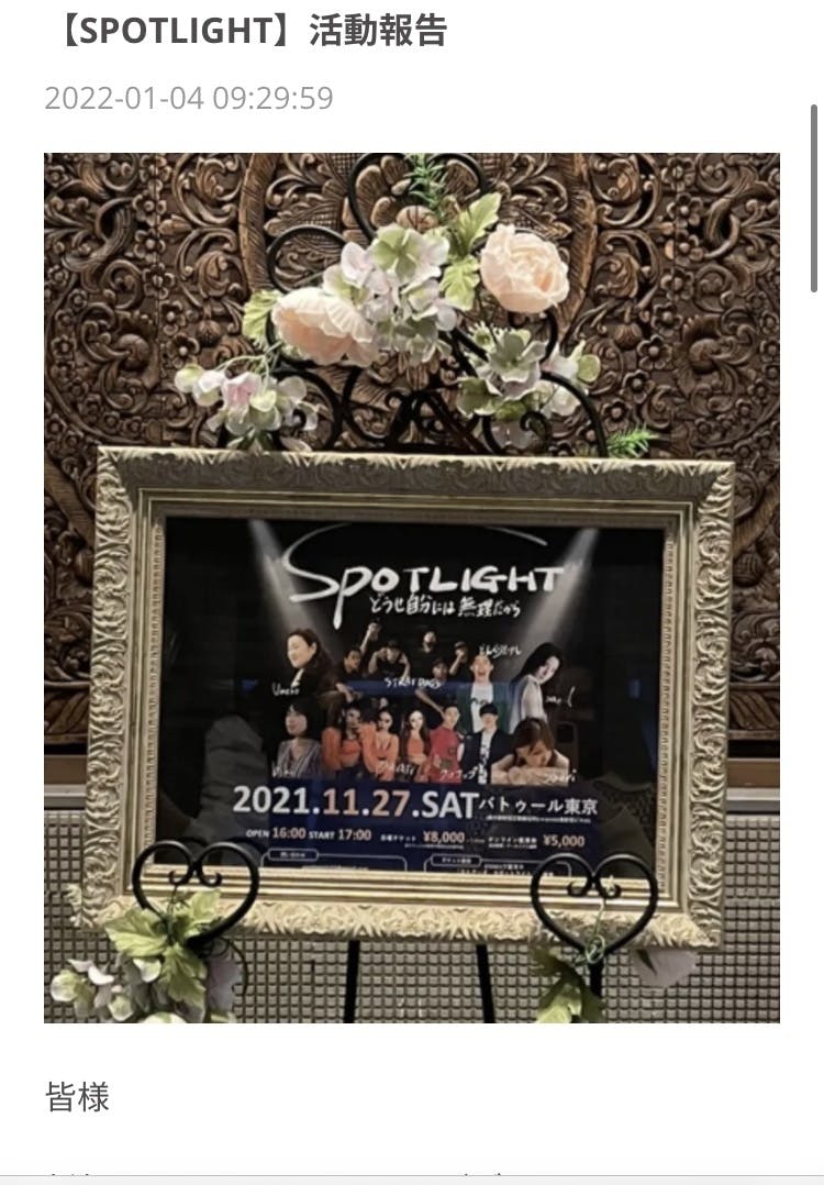 2022/01/04 09:44皆様新年明けましておめでとうございます。昨年は大変お世話になりました。2021年11月27日に開催したSPOTLIGHTというイベントのために昨年クラウドファンディングをさせていただき、多く方にご支援いただきました。結果としてはご支援様の数 91名総額 ¥424,000-/¥2,000,000-未達ではございましたが、このご支援がなければ間違いなく開催できておりませんでした。本当に有難うございました。このイベントを運営する上で、私の未熟さによって多くの方にご迷惑をお掛けし多くの方にサポートしていただきました。本気で夢を追ってまっすぐ努力されているパフォーマー様、そして素敵なパフォーマー様を応援されている方々に関わらせていただけた時間はとても貴重な時間となりました。心より感謝申し上げます。今後のパフォーマー様の益々のご活躍、そしてイベントに関わってくださった全ての方々のご多幸を心よりお祈り申し上げます。本当に有難うございました。 もっと見る