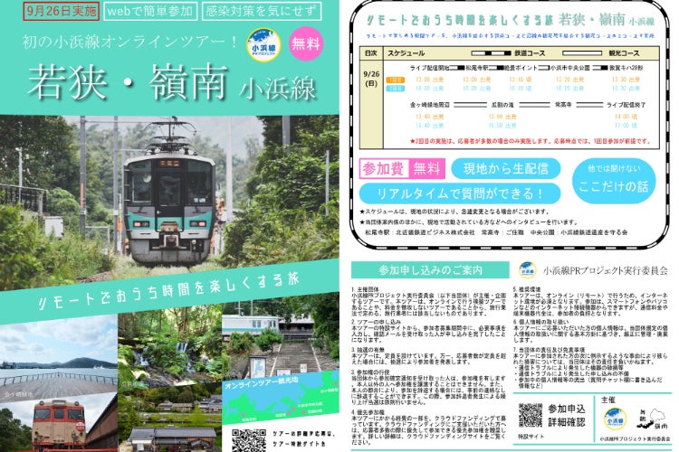 この度企画している「学生が企画!小浜線・嶺南オンラインツアー」は、コロナ禍のニーズとして需要が高まっているオンラインツアーを行うことによって、旅行に行きたいけど自粛している方や、小浜線を利用したことがない人などに、気軽に小浜線沿線について興味を持ってもらうことが目的です。単なるアーカイブ動画の再生ではなく、生配信という様式で行うため、参加者がリアルタイムで質問することが可能で、おうち時間を楽しいものにしてもらえるよう企画しています。また、配信は小浜線沿線(福井県敦賀市~京都府舞鶴市)の複数個所から行うため、特定した地域に精通しておらず、嶺南地方、さらには京都府舞鶴市という地方規模で雰囲気を知ってもらえると考えています。