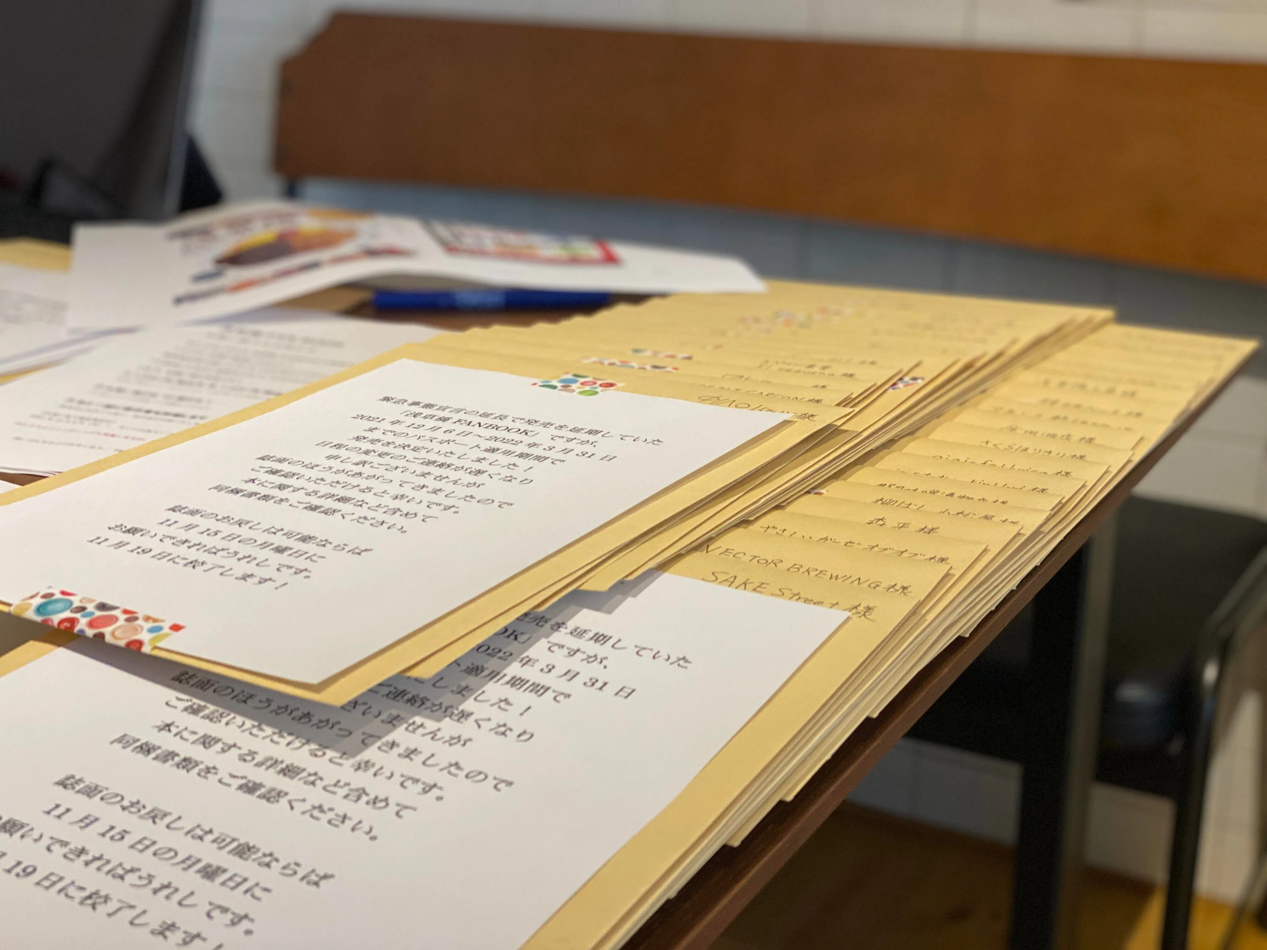 全80ページ、121軒分の最終レイアウトを、スタッフ総出で封筒に納めました。
