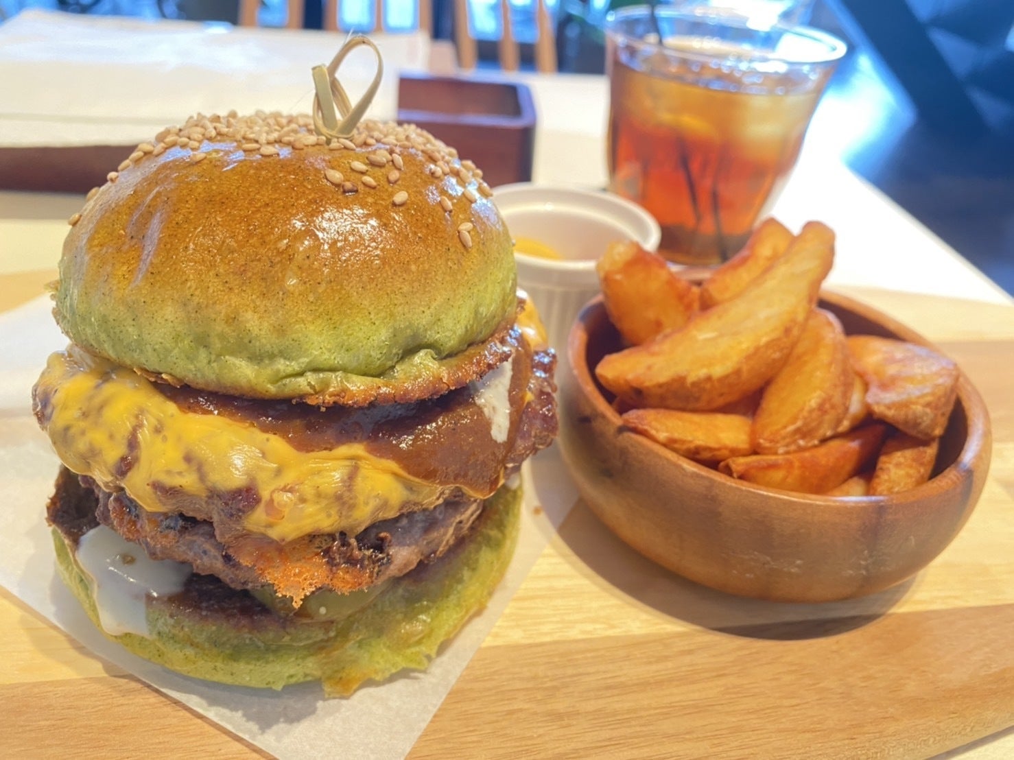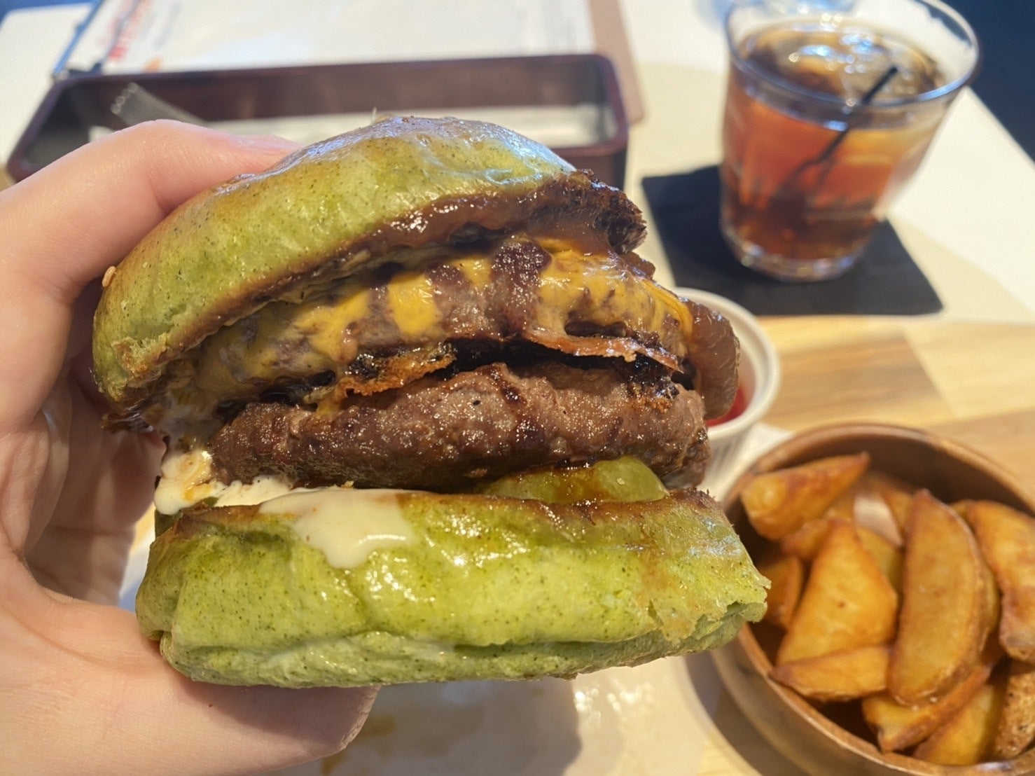 外はサクッと、中はふんわりと焼かれたバンズのほんのり漂うバジルのような味わいと、肉の旨味がギュッと詰まったパティの味。そして、2種類の濃厚チーズの味が噛めば噛むほどでてきて、食べるのが止まらない! 今までで一番のハンバーガーって言っても過言じゃないほどの美味しさでした。