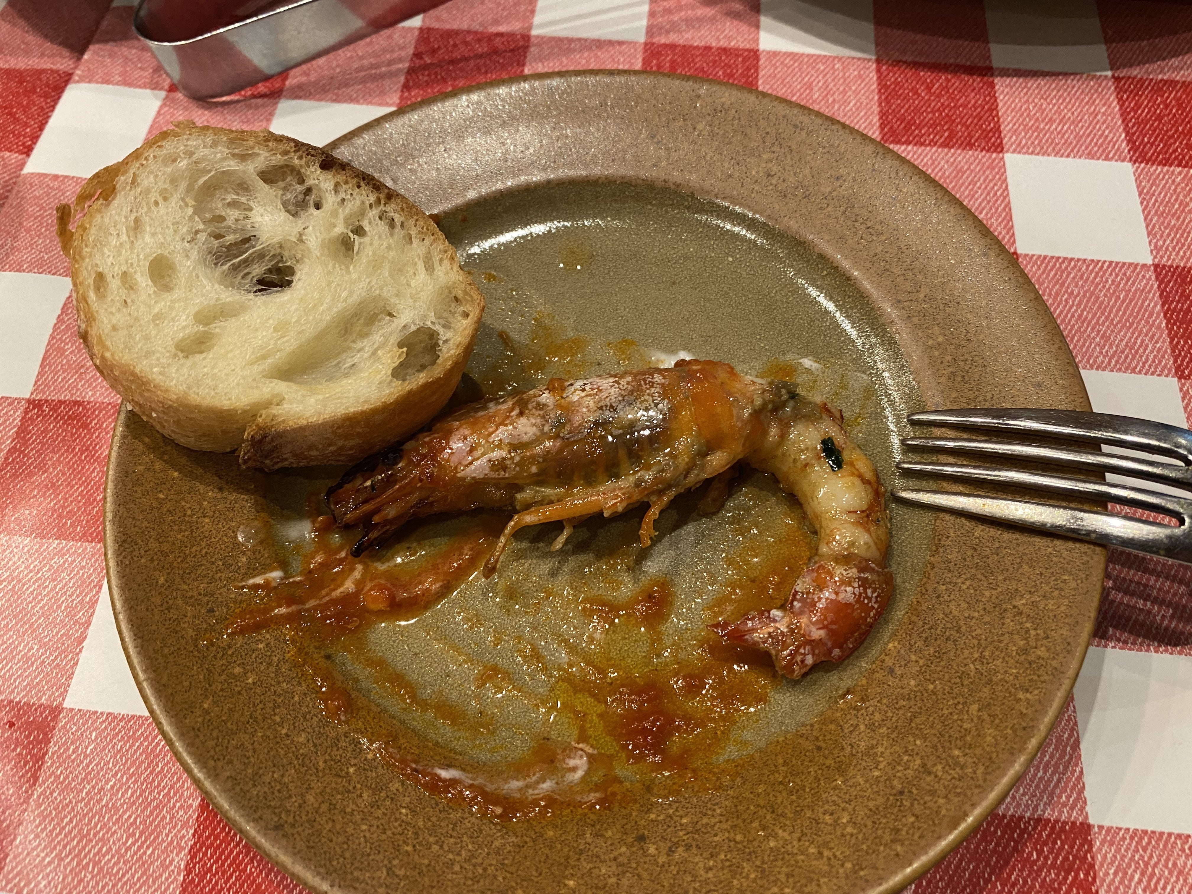 プリプリエビのアヒージョは、おいしすぎて殻まで食べちゃいました(笑)。バケットが330円でつけられるのも嬉しい。