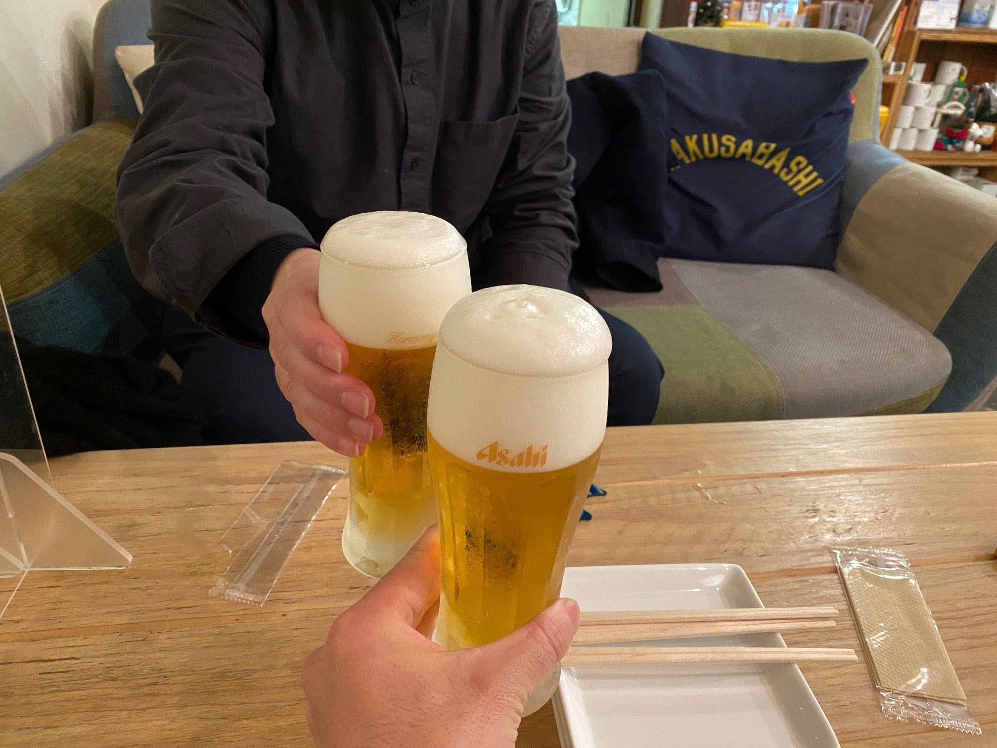カラフルなソファが可愛らしい、居心地最高の「Uchinomi-dining SO」にて、今年の打ち上げ&来年の出版計画を打ち合わせするために、「古書みつけ浅草橋」の店長・堀田と共に訪れました。