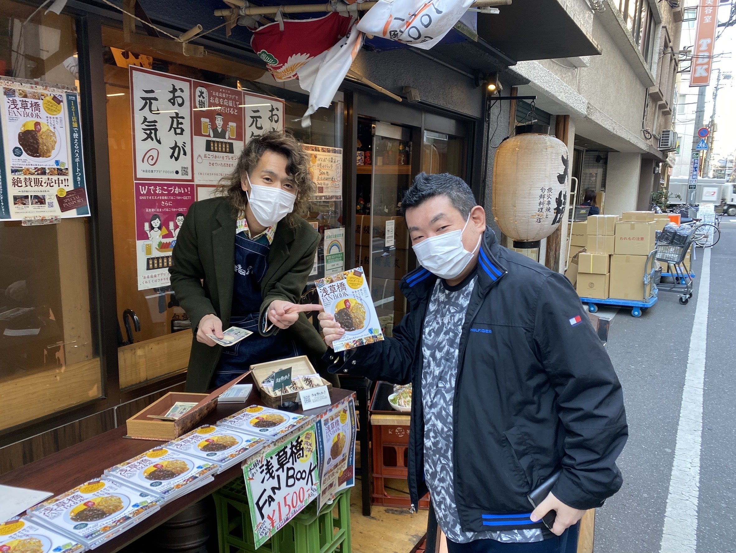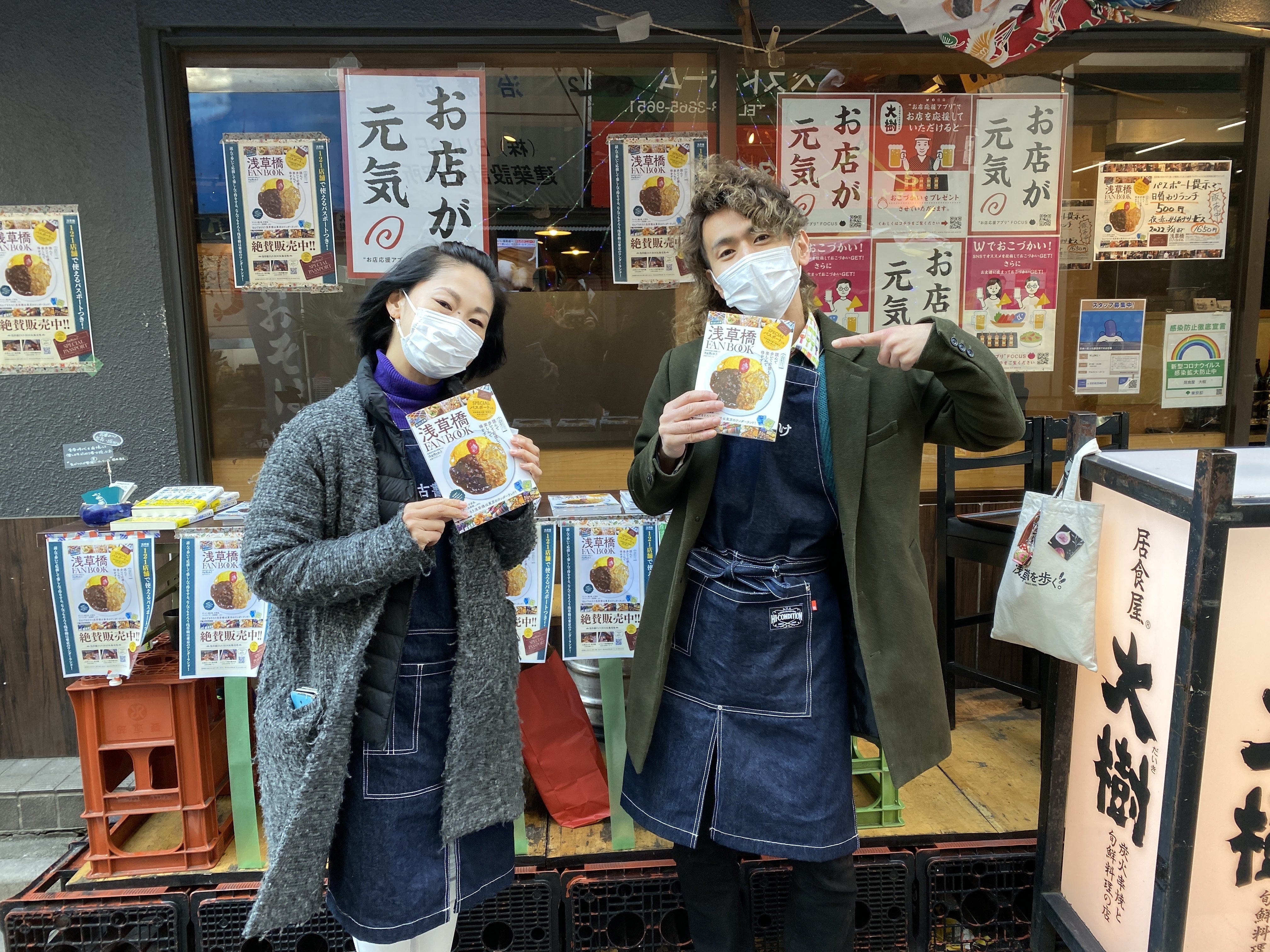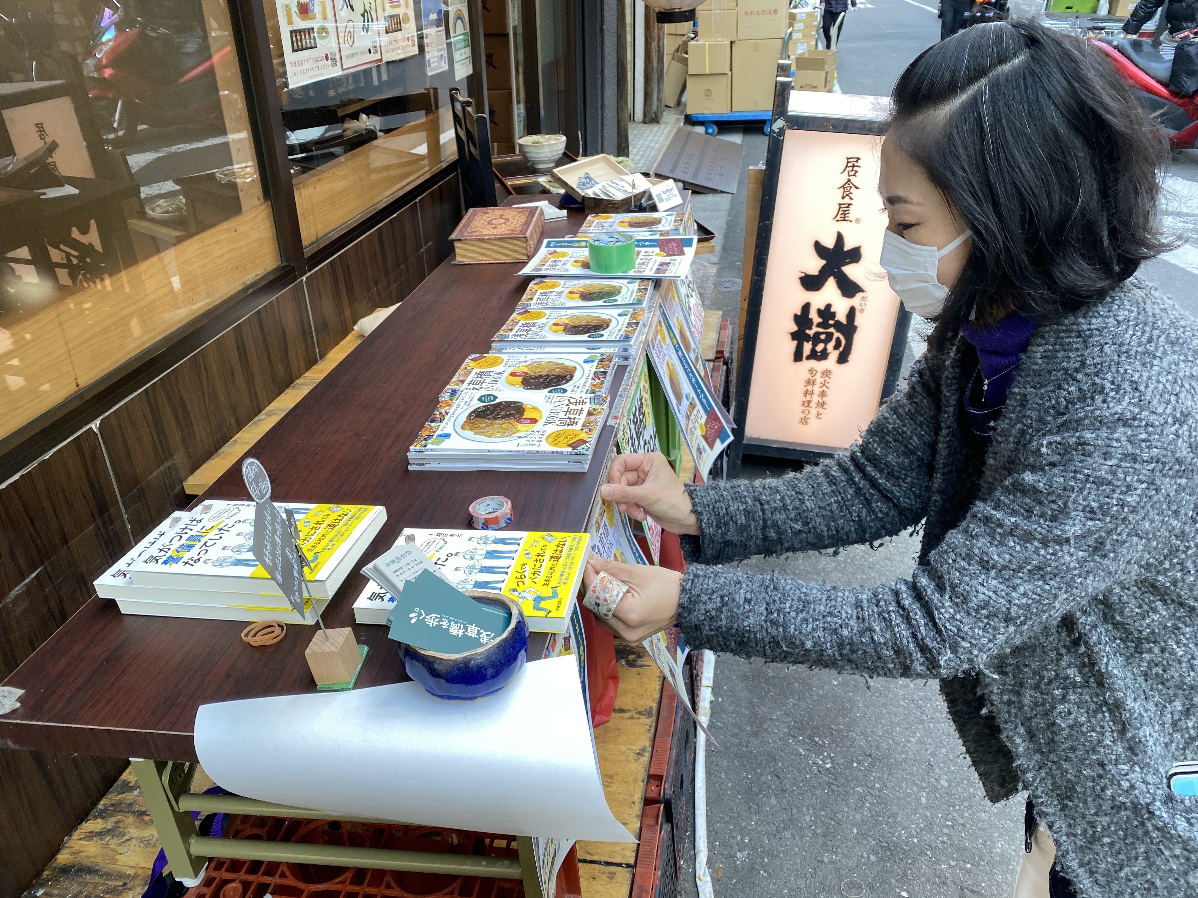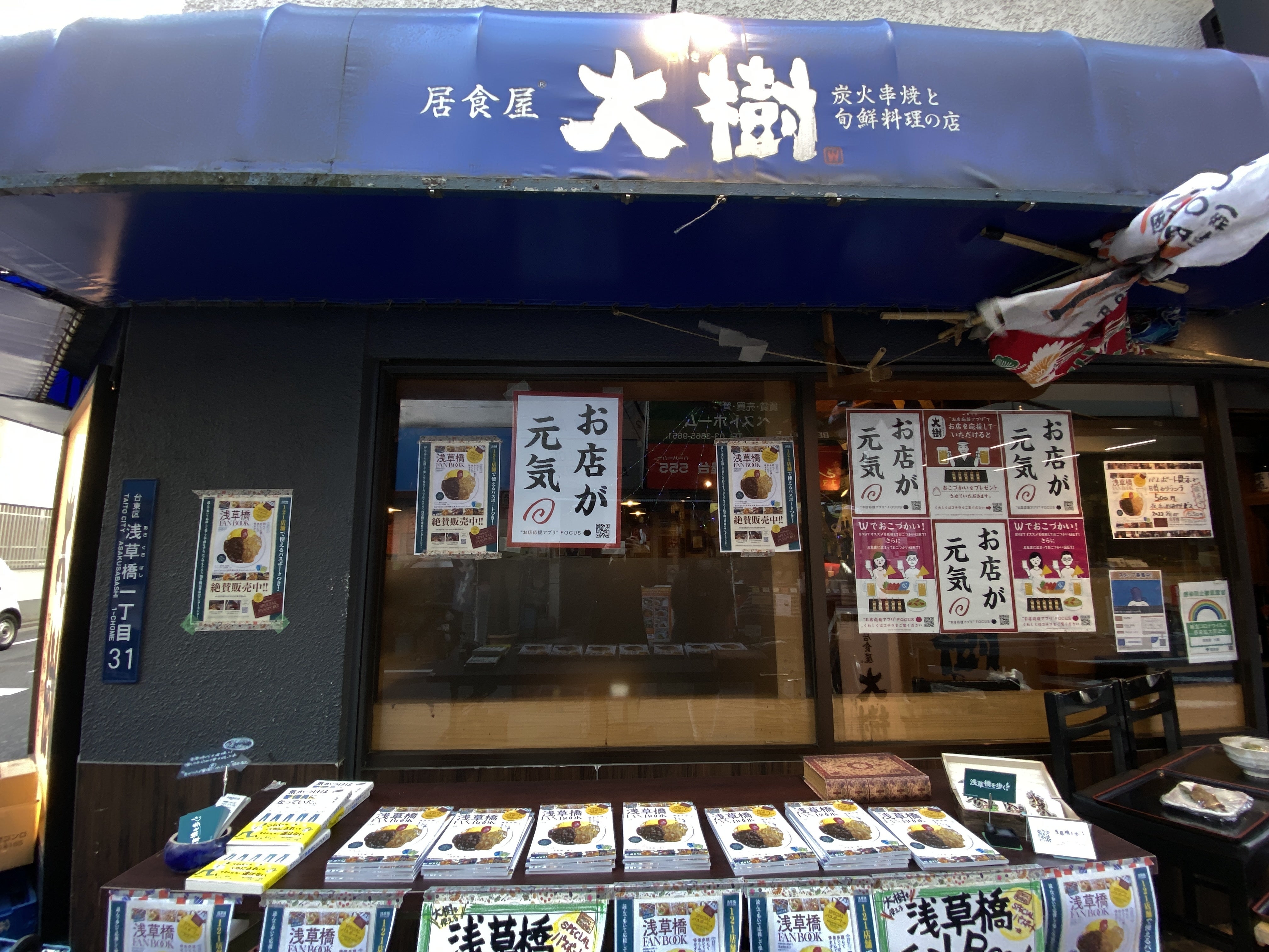 どどん!! ということで、我らが浅草橋の大衆酒場「居食屋 大樹」の店頭をお借りして、即席の浅草橋FANBOOK販売ブースをつくってみました!