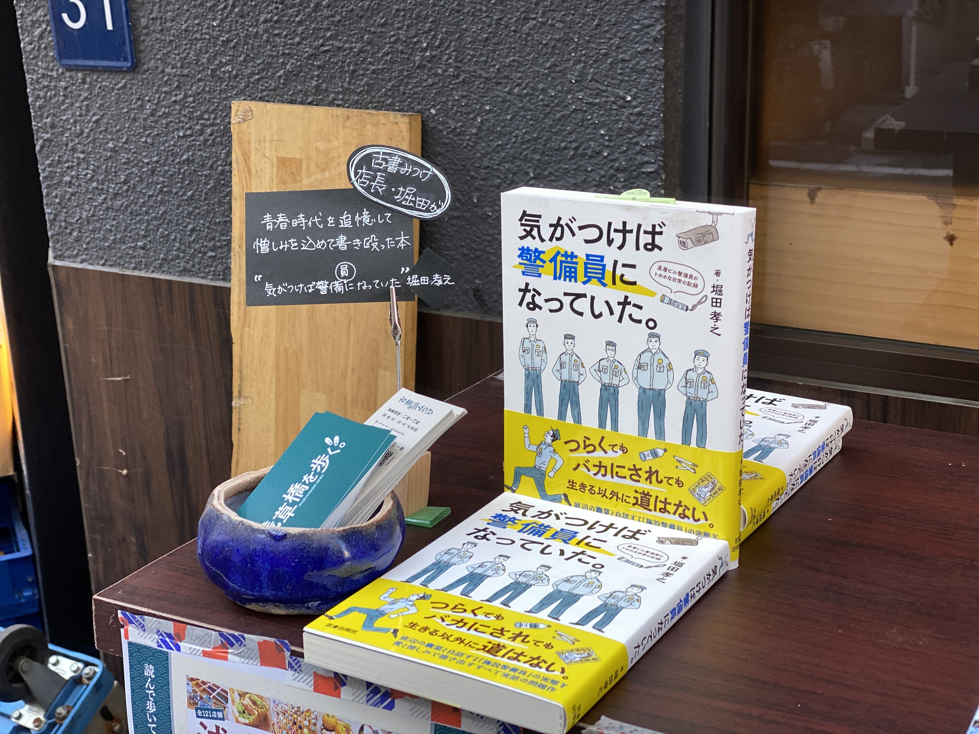 せっかくなので、「出張古書みつけ 浅草橋」ということにして、店長・堀田の著作「気がつけば警備員になっていた。」も販売! 浅草橋を歩く。のサイトカードや古書みつけの栞カードなども並べることで、それっぽい雰囲気がしっかり出せました。