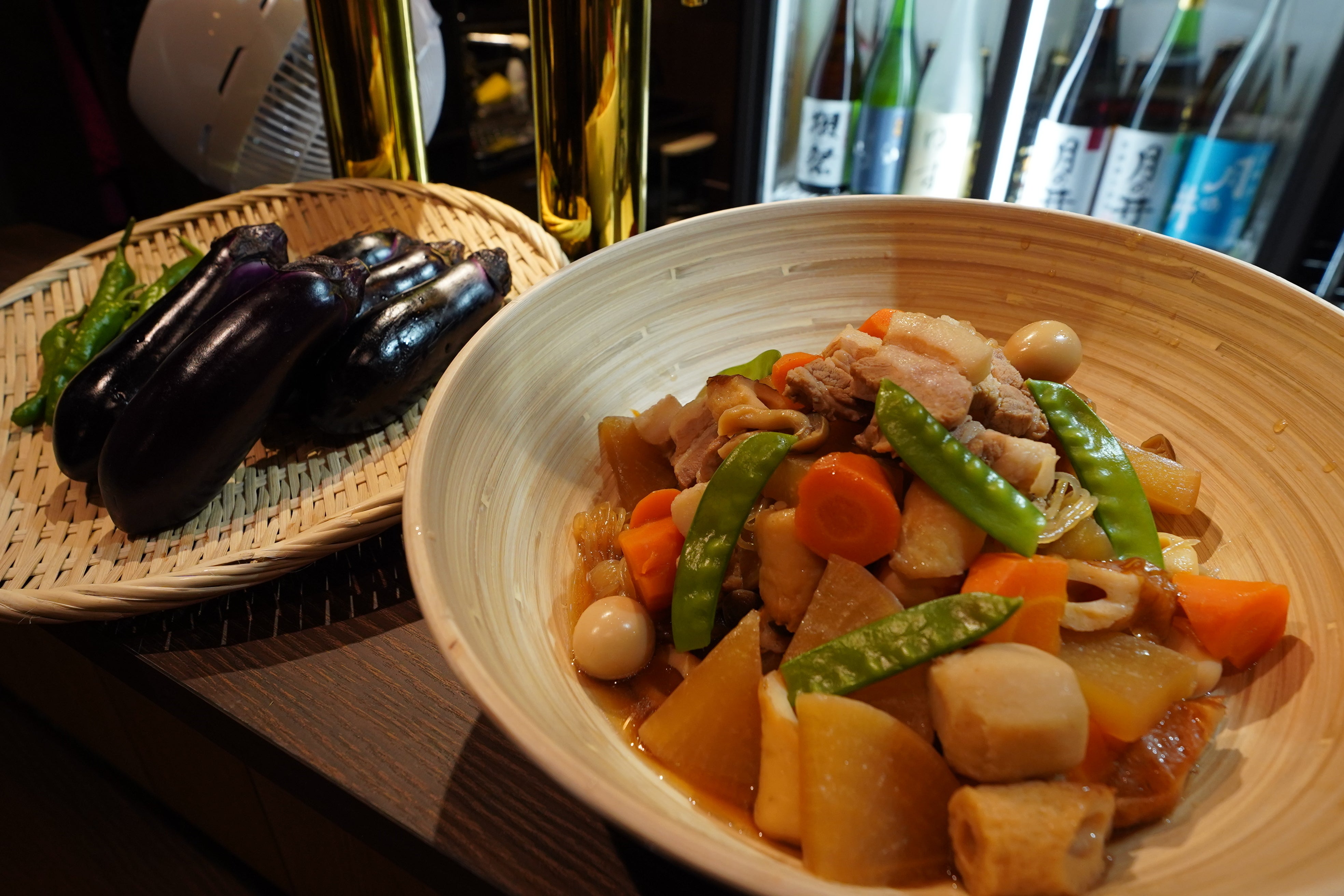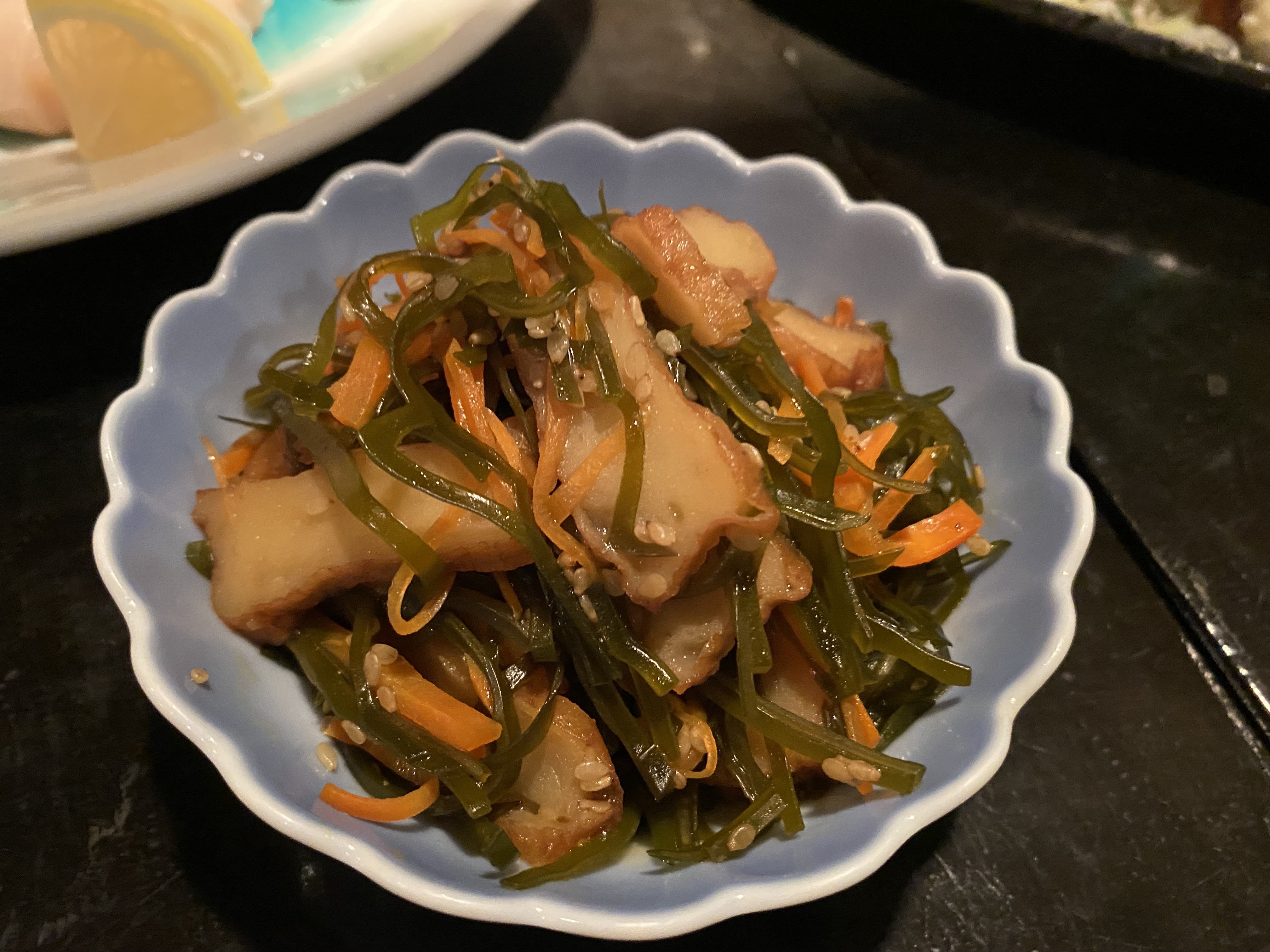 「さつま揚げと切り昆布の煮物」。甘い味付けで酒の肴にピッタリの一品が、タダでいただけるなんて、パスポート特典すごすぎます。