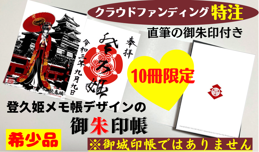 独自で登久姫グッズや登久姫御朱印帳の製作もしている経緯から松本城公式の姫として、皆様の為に、愛され喜んでもらえる松本城公式の御城印帳(クリアポケット付)を作りたいという気持ちが強く芽生えましたが、制作には纏まったお金が必要でした。一時は断念しようかと思いましたが、クラウドファンディングというものがあることを知り、応援してくれる皆様と共に御城印帳を作りたい!