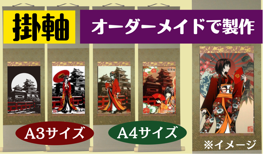 床の間に飾れる高級な掛軸を特注製作!職人が丁寧に仕上げる正絹仕立ての逸品。桐箱に入れてお届けします。A3は限定1点、A4は限定2点でどちらもここでしか手に入らない限定品