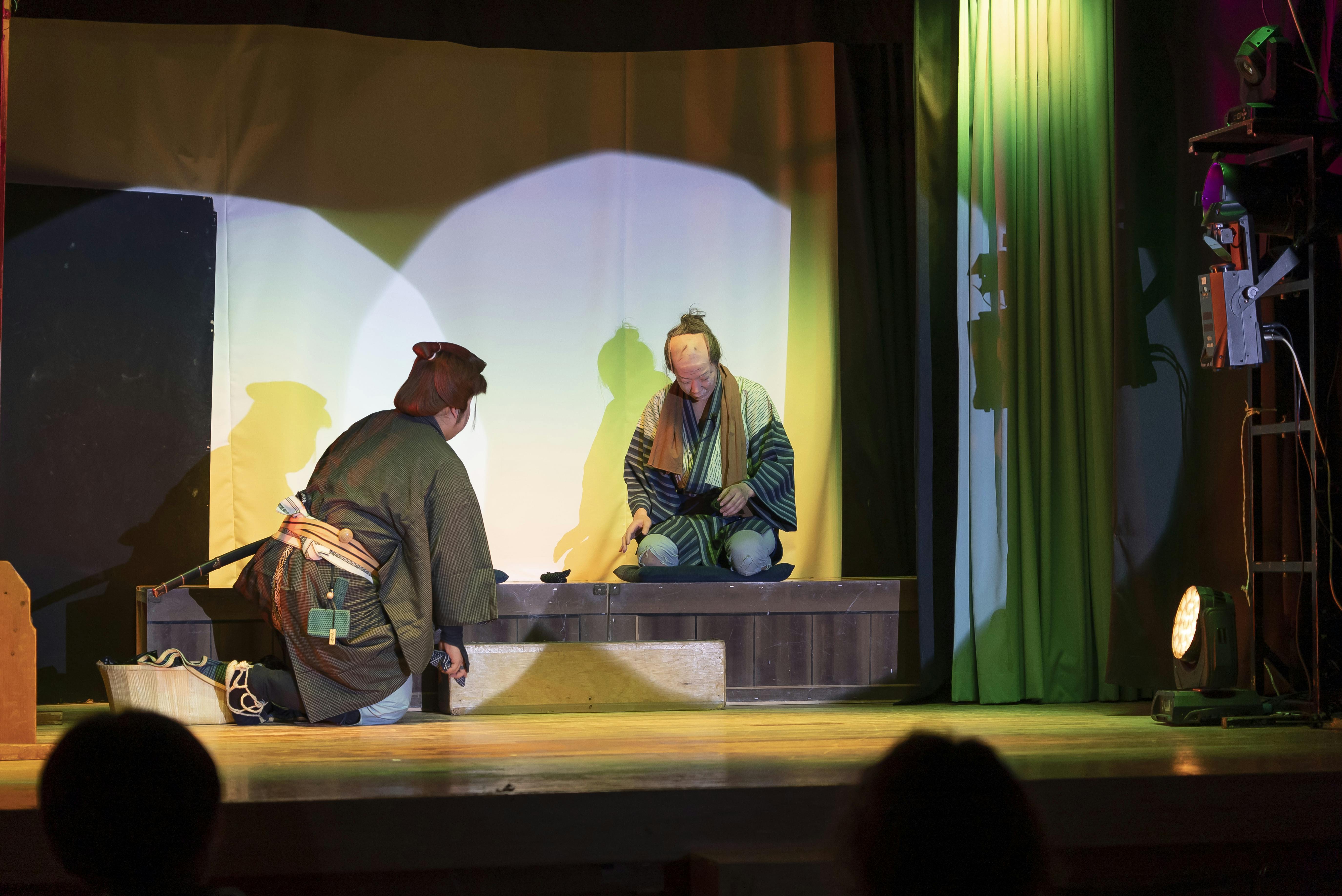 芝居は、分かりやすい勧善懲悪の時代劇を軸に、観客との掛け合いや時事ネタ等を取り入れて笑いを添えます。例えば、観劇しているファンの持ち物をイジったり、逆に観客からツッコミを受けたりします。