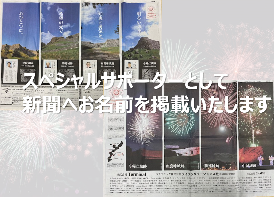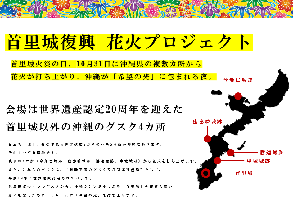 沖縄のシンボルである世界遺産「首里城」の復興を願い、2020年10月31日20時、今帰仁城跡、座喜味城跡、勝連城跡、中城城跡よりリレー方式で「希望の光」を打ちあげました。