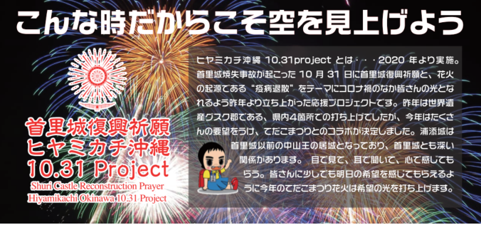 コロナ禍で中止となった「浦添てだこまつり」。例年以上に子どもたちが楽しみにしていたイベントとして、最終日にあたる今年の10月31日は、ヒヤミカチ沖縄とのコラボレーションとして浦添城からも花火を打ち上げます。琉球歴史ドラマ「テンペスト」の再現を考え、琉球舞踊などの演出により、シーンを盛り上げます。