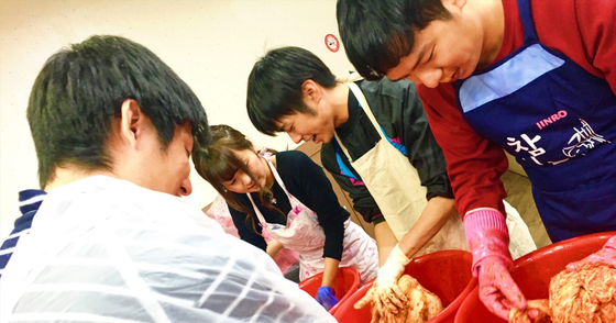 白菜一玉分を切らずにそのまま使うので、一枚一枚に塗りこむのは一苦労!苦労しながらも日韓キャスト同士で会話をしながらの 作業は、ミュージカルづくりと同じように交流を生み出していました!やはり「違い」があっても「何かを一緒に作る」ということは、心を混ぜ合うんだなと改めて感じた瞬間でした。