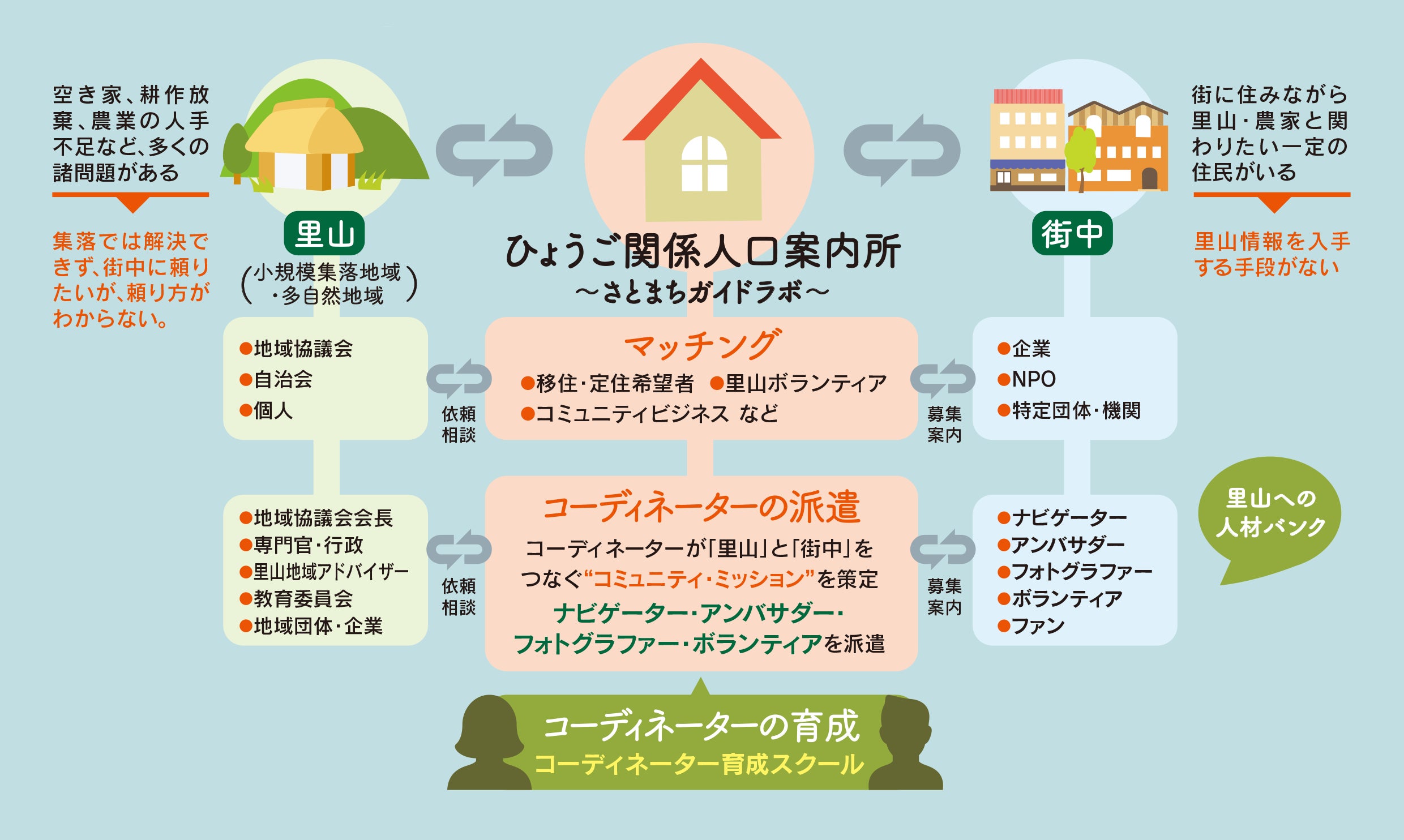 はじめまして、私達「ひょうご関係人口案内所・さとまちガイドラボ」は、「里山」と「街中」を行き来しながら里山地域に継続的に関わる者※(関係人口の定義)を案内し、「街中」から「里山」へのつながりを築き、新しいヒトの流れを創出することを目的としています。