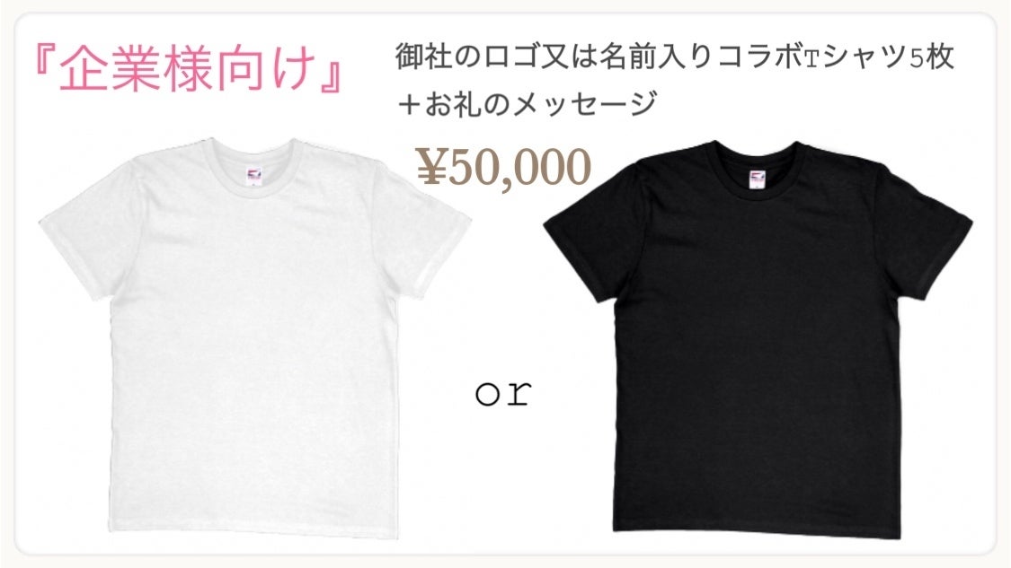 ①50,000 御社のロゴ又は名前入りL&FコラボTシャツ5枚(ブラックorホワイト)+お礼のメッセージ