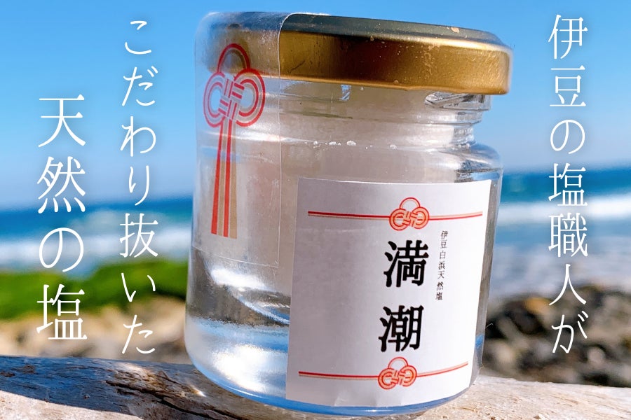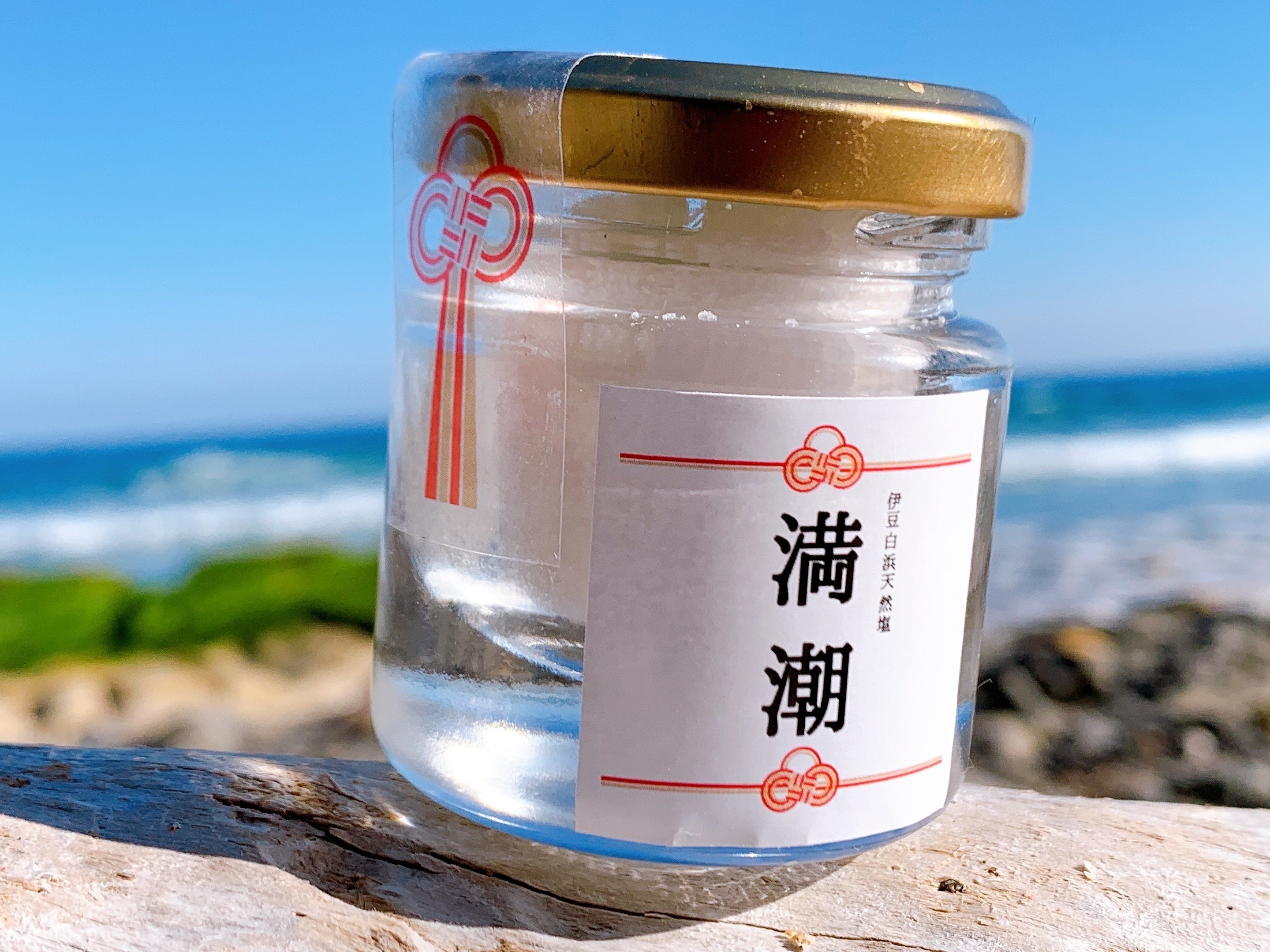 下田市1番のビーチ、伊豆白浜の海水から手作りした天然塩は、口に入れると下田のきれいな海の優しい香りを感じることができます。塩の粒が細かくデザートのアクセントだけではなく、薬味や調味料としてもお使いいただけます。