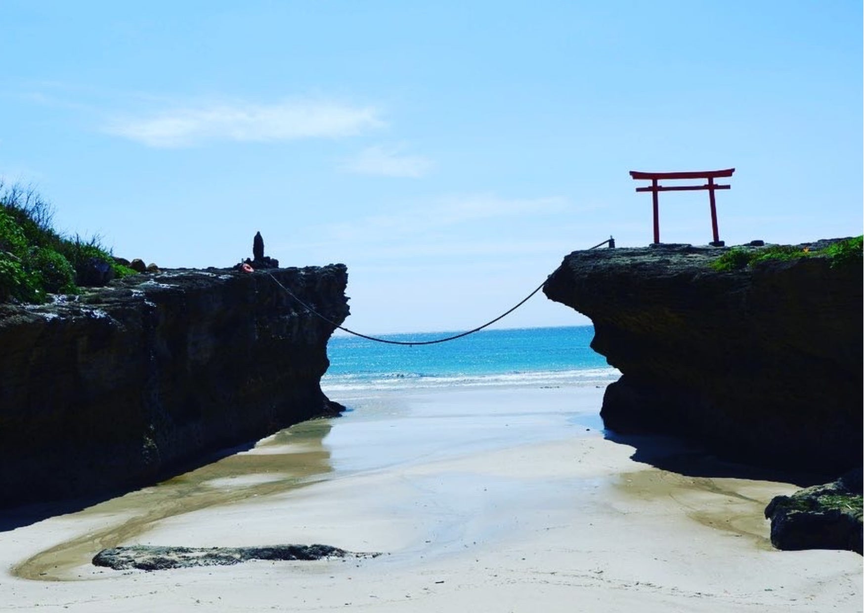 境内には、樹齢2,000年を超える巨木があり、裏手には美しい白砂で有名な白浜海岸の海が広がっています。海岸に面して鎮座する巨大な大明神岩と、朱色が空と海に映える鳥居が絶景ポイントとしても人気です。
