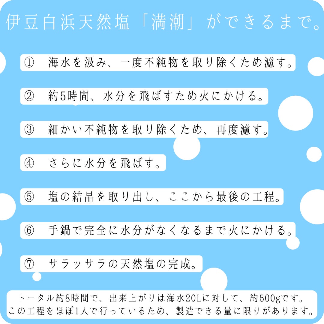 「満潮」は、含まれる水分量がとても少なく、粒が細かいサラサラの塩です。そのため、製造工程で水分を多く飛ばすため、1回の作業でできる塩の量はごく僅かです。海水を汲むところから、製造、梱包まで全て手作業で行っているため、大量に製造することが難しい商品です。