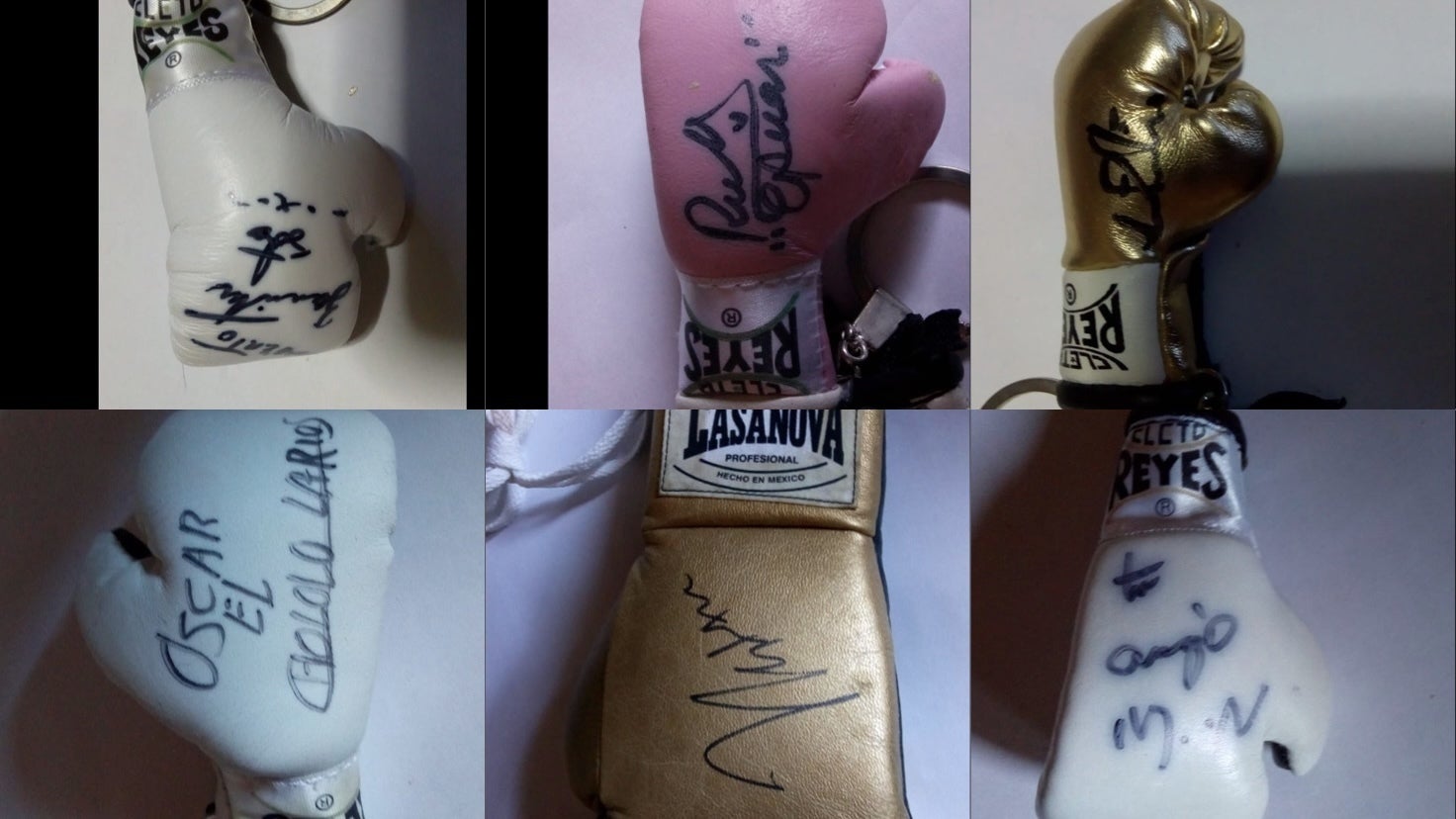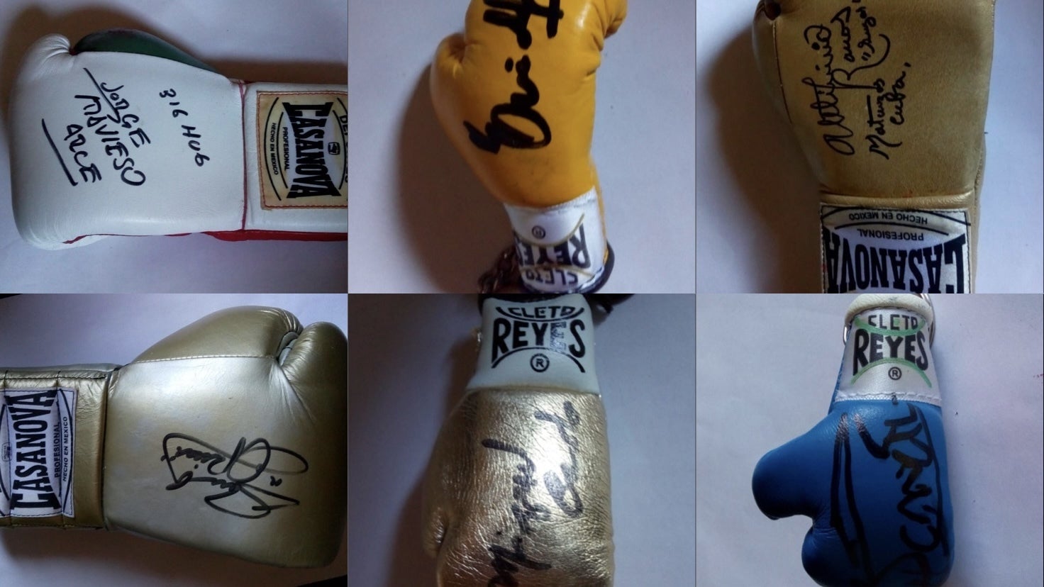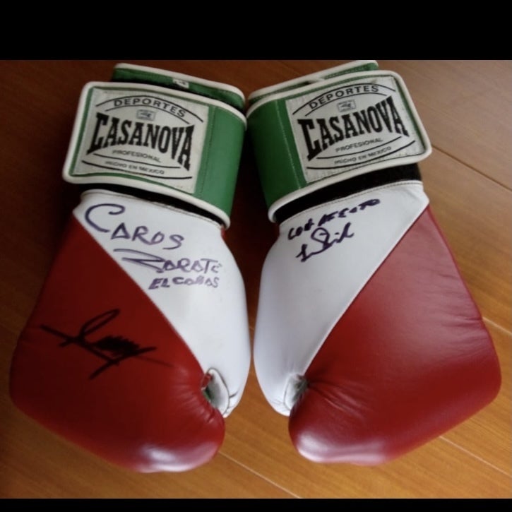 こちらは15年に渡るメキシコ生活で古川氏が集めたグローブサインです。カネロ、チャベス、モラレス、サラテ等、錚々たるレジェンドチャンピオンの名前がズラリ!