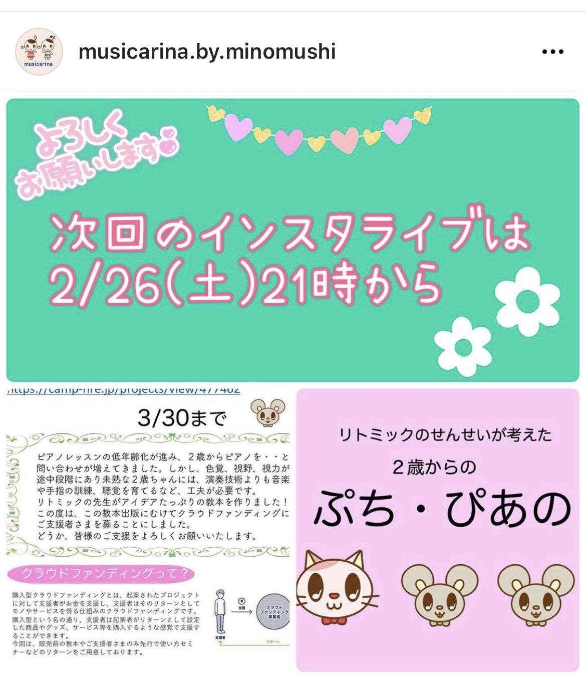 2/14(月)に初めてインスタライブを配信しました!教本のご紹介や、実際のレッスン動画をみていただいたり、クラウドファンディングのお話もさせていただきました♪次回は2/26(土)21時から21時30分での配信となります♫ご視聴お待ちしております♡