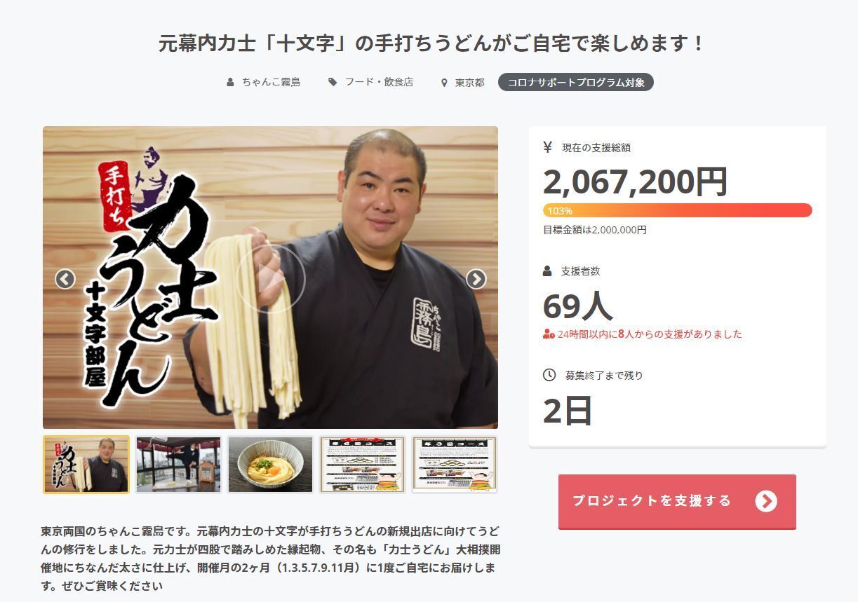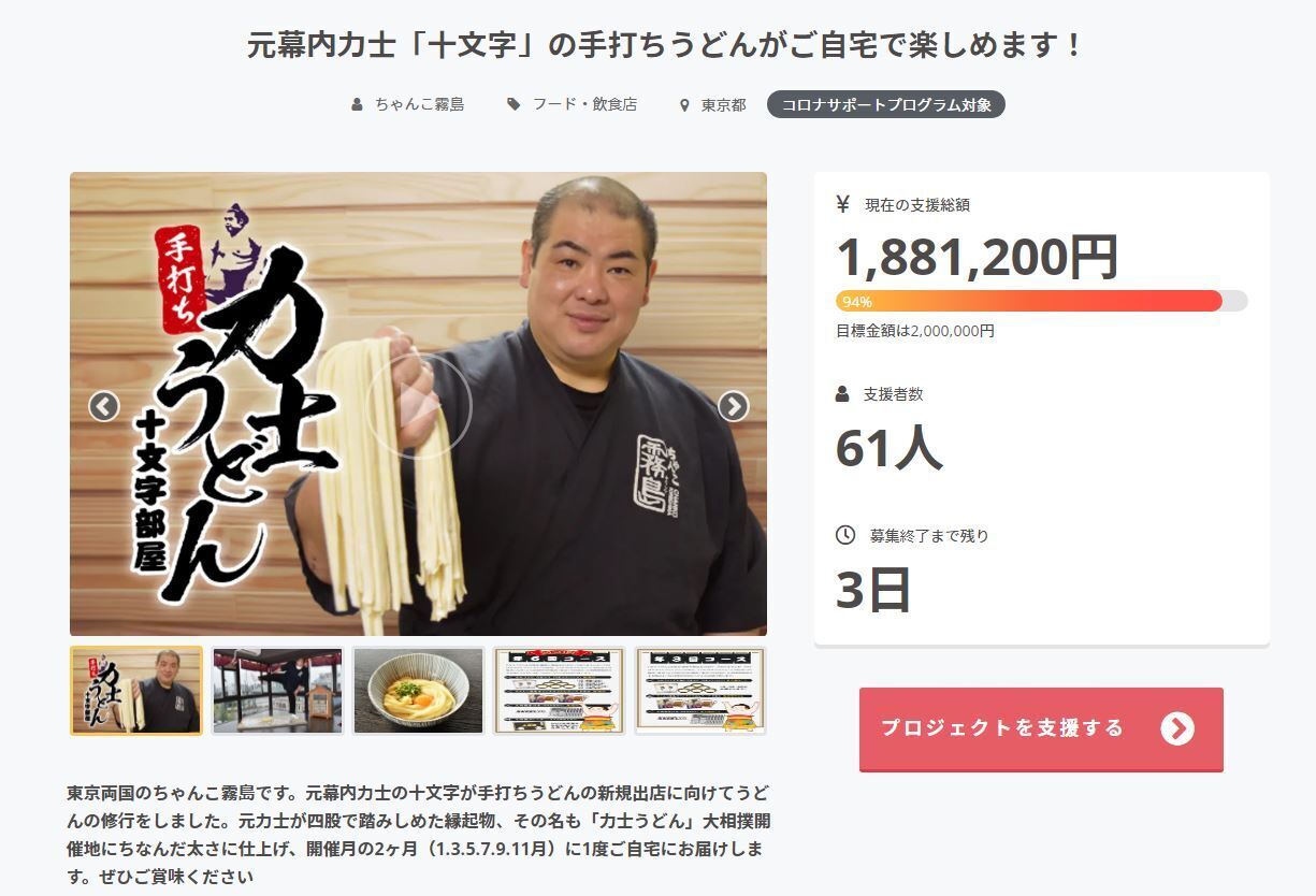 力士うどんプロジェクトも残り3日となりましたご支援いただきました皆様、心より御礼を申し上げます。本当にありがとうございます!本日は応援メッセージをご紹介させて頂きます。『美味しいうどんお届けいただけるよう、頑張ってください!!』『応援しています!頑張ってください!』『力士うどんは知りませんでした。是非食べてみたいです。』『ちゃんこ霧島大好き!十文字さんの力士うどん、ずっと食べてみたかったのですがなかなかお店まで予約に行けなかったので嬉しいです』『10/6(水)RCCラジオで放送されていたのを聞きました。相撲好きの父を喜ばせたいと思い、購入させていただきます。』『力士うどんの大ファンです☆お店ができること、期待しています』『以前食べたときにとても美味しかったので楽しみにしています☆頑張ってください!』沢山のメッセージを頂きました!ありがとうございます!------------------------------------☆目標金額:2,000,000円------------------------------------☆支援総額:1,881,200円------------------------------------☆達成率:94%------------------------------------☆支援者数:61名様------------------------------------《10/18(月)18:00現在》達成率94%!!あと少しで達成となりますここまで来ましたら達成に向けて突っ走るのみです!毎度のお願いではございますが、facebookやTwitterなどのSNSのや知人や友人の方にLINEでお知らせしていただけたら嬉しいです!よろしくお願い致します!◎プロジェクトURL◎https://camp-fire.jp/projects/view/477538