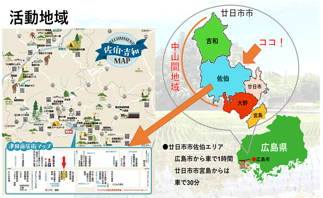 広島県廿日市市佐伯エリアは、人口120万人の広島市に隣接し、年間30万人以上の来島者のある世界遺産宮島からも車で30分という、都会の近くにある田舎です。津田は、苺や長ナスといった食材だけでなく「佐伯醤油」など昔から人気の特産物があったり、最近は「さいきビール」といった新たな品も完成しました。また、中四国地方で唯一のフィールドアーチェリースポット「佐伯国際アーチェリーランド」があったり、コロナ禍でも利用増加がみられた「岩倉ファームパークキャンプ場」があったりと、アクティビティも多い地域で、他の田舎にはない魅力も持っています。
