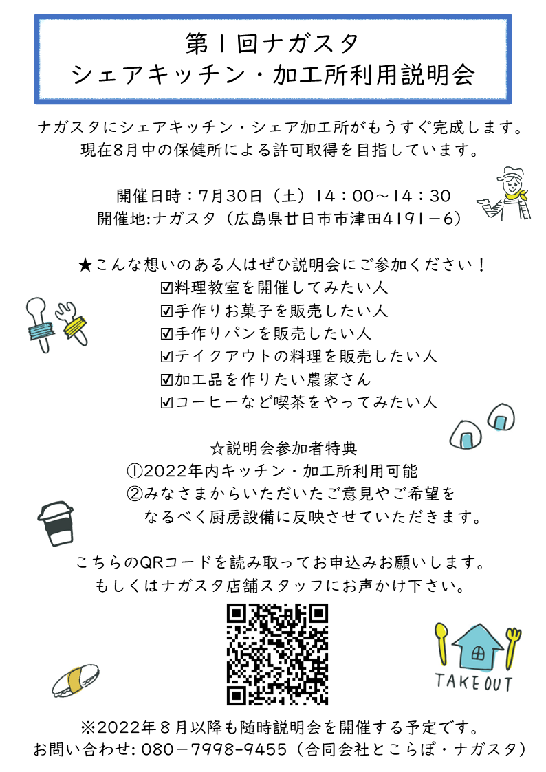 2022/07/23 13:17ナガスタクラウドファンディング支援者の皆さま 長らくお待たせしてしまいましたが、ナガスタにもうすぐシェアキッチン・シェア加工所が完成します。現在8月中の保健所による許可取得を目指しています。 そして、7月30日に『第1回ナガスタ シェアキッチン・加工所利用説明会』を開催する事となりました。皆さまのご参加お待ちしております。開催日時:7月30日(土)14:00~14:30開催地:ナガスタ(広島県廿日市市津田4191−6)★こんな想いのある人はぜひ説明会にご参加ください! ☑料理教室を開催してみたい人 ☑手作りお菓子を販売したい人 ☑手作りパンを販売したい人 ☑テイクアウトの料理を販売したい人 ☑加工品を作りたい農家さん ☑コーヒーなど喫茶をやってみたい人☆説明会参加者特典 ①2022年内キッチン・加工所利用可能 ②みなさまからいただいたご意見やご希望をなるべく厨房設備に反映させていただきます。こちらのURLのリンクからお申込みをお願いします。⇒ https://docs.google.com/forms/d/e/1FAIpQLSfyzmOlk_pwTSUZ6A3nCtKhSZp1sxfbOVfCUpD--sLyxmSJOQ/viewformもしくはナガスタ店舗スタッフにお声かけ下さい。※2022年8月以降も随時説明会を開催する予定ですので、今回は参加が難しいという方もぜひいつかご参加いただけたら幸いです。お問い合わせ: 080−7998-9455(合同会社とこらぼ・ナガスタ)【Instagram】https://instagram.com/nagasuta.saiki?igshid=YmMyMTA2M2Y=【公式LINE】https://lin.ee/wVFLvOP引き続き、ナガスタの応援をどうぞよろしくお願いいたします。スタッフ一同 もっと見る