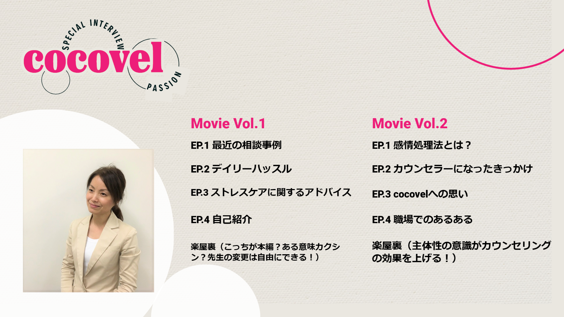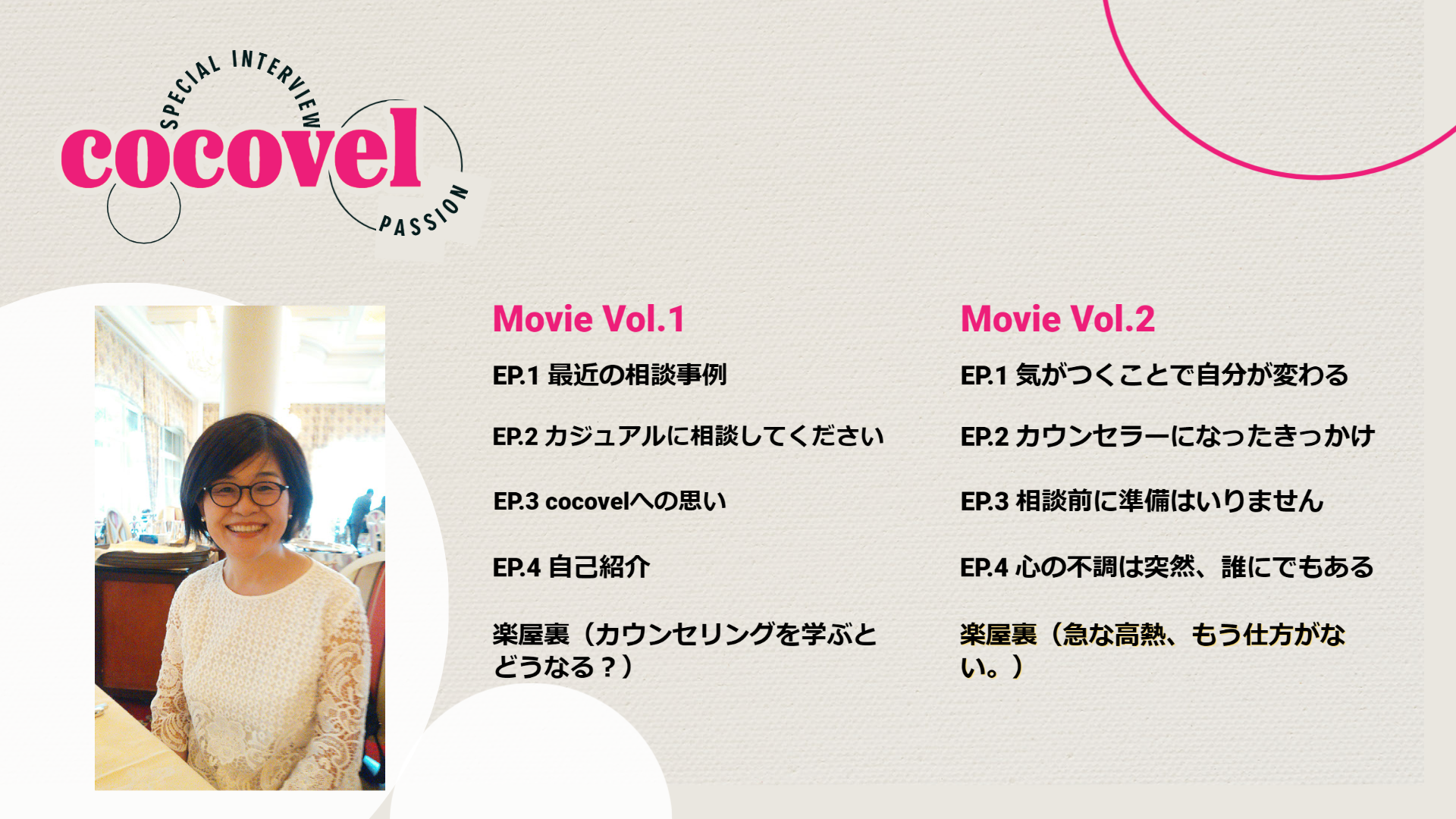 2021/11/14 14:47/丹野ゆき先生インタビュー!!丹野ゆき先生にcocovelとカウンセリングに対する熱い思いを語って頂きました!!\カウンセラーのここが知りたい!カウンセラーのカクシンに迫る!連続インタビュー企画の第7回は、丹野ゆき先生の登場です!!とうとう、最終回となりました!!本シリーズをご覧頂き、誠にありがとうございます。東京都を中心に活躍されている丹野ゆき先生!!カウンセリングを自己実現のために活用する人が増えています!!自身のパフォーマンスを改善したり、新しいことへの挑戦などもう一歩踏み出すためにはどうしたらよいのか。こうした悩みに対するカウンセリングを行い、クライアントの変化を促しています!!カウンセリングを有効活用するためにはどうしたよいのか!?せっかくの時間を費やすのだから、その成果は最大限にしたいところです。インタビューではこうしたお悩みにも言及し、「どう変わりたいか」を明確にすることが重要と解説しています。もちろん、ちょっとしたストレスについての相談も随時受け付けています!!好きなことには気が付かない。好きなことを心から楽しむことができない。「好きで始めたのだから」こうした思いを、”重い”にしないことの大切さについても言及しています。また、好感度の高い相手ほど、実はストレスの原因になっている。好きだからこそ不満が溜まってしまう。こうした日常生活や仕事上の「あるある」も是非ご覧ください。毎日スッキリ、楽しく過ごすことのヒントが多くあります。ボディメンテナンスのためにジムに通う。心のメンテナンスのためにカウンセリングを利用する。自身のパフォーマンスを改善するため、こうした人も増えてきています!!忙しい朝だからこそ、早朝のジムとカウンセリングを交互に実施。是非、ご視聴ください!!Vol.1Vol.2カウンセラーインタビューは今回(第7回)で最終回になります!!カウンセラーのカクシンに迫るということで、通常は情報として得ることが難しい内容まで踏み込んでインタビューを行いました!!気にはなるけど、どう利用したらいいの?こんな悩みでも相談できるの?そもそも悩みかどうかも分からないけど相談に乗ってくれるの?といったお悩みも、この動画シリーズをご覧頂くことで解消できるのではないでしょうか。また、カウンセリングは聴く力、ということで、仕事のパフォーマンスを上げたり、日常生活の快適さをアップデートしたりと、今の状態をよりよくする使い方にも多くのコメントを頂きました!!日々の生活をスッキリ・楽しくするためには、何が必要なの?ということで、感情処理についても多くのコメントがありました。サクッと手軽に出来るので、このインタビュー動画を見て頂くだけで、すぐにでも実践できるように思います。もちろん、もっと手法を知りたいという方は是非、先生に連絡してみてください!!さらに、体のメンテナンスでジムに通うように、心のメンテナンスでカウンセリングを利用することにも触れて頂きました!!この辺は目から鱗なところもありますが、よく考えてみると集中力や注意力を高めるには、カウンセリングの手法が有効なんだと改めて思いました。カウンセリングを利用することで、自身を客観的に認知することに繋がる。メタ認知能力の向上に繋がります。メタ認知について本稿では詳細に触れませんが、”よいこと”なのは間違いありません。そして、多くの人が気になる「よいカウンセラーを探すには?」「先生の変更はできるの?」といった、なかなかメディア等では触れられない(インターネットを検索しても出てこない)情報にも多くのコメントを頂くことができました!!変更はいつでも出来ますので、気になる先生がいたら、お気軽にアクセスしてみてください。 もっと見る