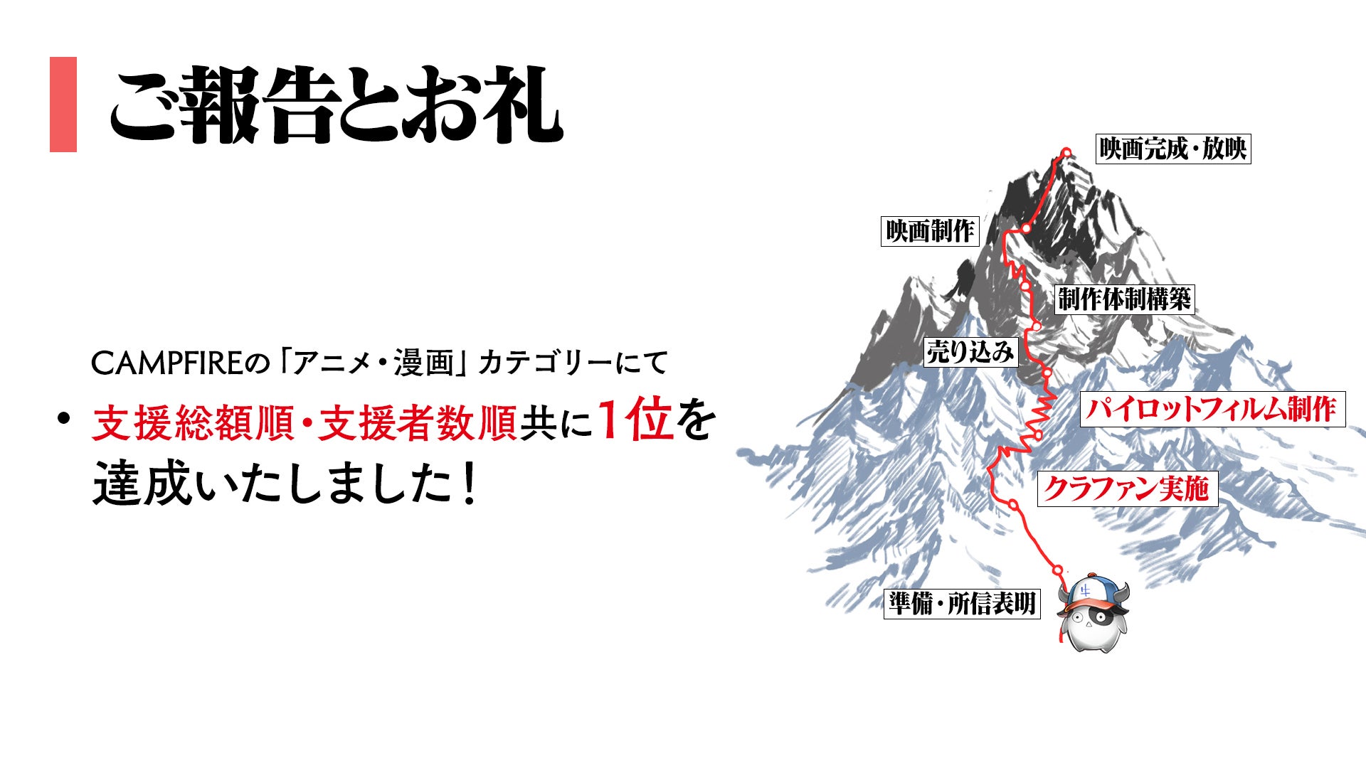 「狂気山脈アニメ映画化プロジェクト」あらため『狂気山脈 ネイキッド・ピーク』制作幹事のまだら牛です。10/10より開始し2ヶ月間実施していた本クラウドファンディングも、ついに明日12/14(南極の日)で最終日となります。12/13 16:00現在、 ・達成率1200%越え! ・支援総額9,800万円越え! ※「アニメ・漫画」カテゴリ歴代1位 ・支援者数9,300人越え!(エベレストの標高8,849mを越えました……!) ※「アニメ・漫画」カテゴリ歴代1位 ※全プロジェクト中、歴代6位……と、とんでもないことになっております。自分が生み出した作品がこんなに愛され、応援されるコンテンツになったご縁に、感謝してもしきれません。再三申し上げておりますが、このクラウドファンディングは長いプロジェクトの始めの一歩です。ここからが本番。これだけの期待とご支援を頂いたのですから、それに見合う作品に全力で仕上げなければなりません。ここ数ヶ月、クラウドファンディングを成功させるための施策や、アニメ化実現のための体制づくりなど、ずっと動きっぱなしでした。(【SIX SUMMITS・プラン】追加リターンの進捗報告書を読んでくださった方はどれだけ激動だったかの一端を感じ取っていただけたかと思います)明日でクラウドファンディングが一区切り。制作も具体的に次のステップが動き始めます。年末までは諸々の調整で忙しい日が続きますが、年内は走り抜けて、2022年に入ってからは腰を据えて、『狂気山脈 ネイキッド・ピーク』をいい作品に仕上げるための創作的な活動に没頭したいと思っています。残すところあと1日、最後までどうぞよろしくお願いいたします。