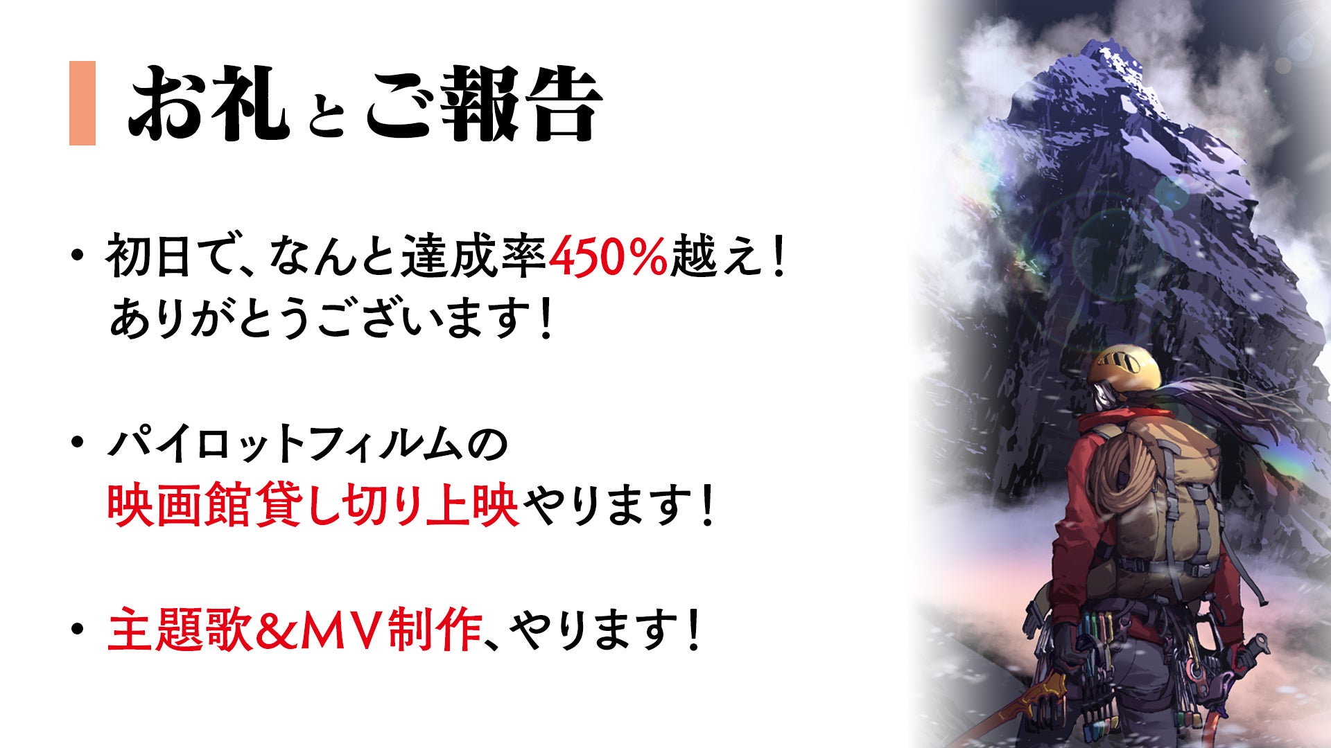 狂気山脈アニメ映画化プロジェクトの幹事、まだら牛です。昨日公開したばかりの本プロジェクトのクラウドファンディングですが、・開始20分弱で支援目標額達成・当日中に達成率450%越えという、想像もしていなかった多大なご支援を賜りました。CAMPFIREの支援者コメントやメッセージ、Twitter等のSNSでも、たくさんの温かい応援のコメントをいただきました。本当にありがとうございます。個別にお返事を出すことが難しく申し訳ないのですが、この場を借りて感謝の気持をお伝えさせていただければと思います。昨日は本プロジェクトの開始を記念し、YouTube Liveにて凸待ち耐久生配信を行っていたのですが、そちらでも本当にたくさんの方が遊びに来てくださり、あるいはメッセージを届けてくださりました。(※概要欄に来て下さった方々を記載させていただいています。有志の方がコメントにてタイムスタンプもつけてくださっていました。ありがとうございます。)今回アニメ映画化を目指す作品は、僕が表に出てエンタメの場で活動を始めるきっかけになったものであり、本当にたくさんの素敵な出会いを僕にもたらしてくれました。この企画は「僕の夢」でもありますが、こういった多くの方々との出会いや、応援してくださる沢山の方々、そういった僕個人の力の及ぶ範疇を大きくこえた、まるで神様のはからいのような大きな渦の中にあると思っています。この企画に期待を寄せご支援・ご助力を下さった方々が、「関わってよかった」と心から思う作品に仕上げる責務があると思っています。死にものぐるいで挑みますので、どうかお力添えをよろしくお願いします。ストレッチゴールについて「何%達成でこれをする~」といった感じで事前にストレッチゴールを提示はしていなかったのですが、もともとご支援額が目標額を越えた場合には行いたいと思っていたストレッチゴールがいくつかありました。有り難いことに、初日にして既に目標額を大幅に……本当に大幅に越えましたので、そのうちいくつかを実施することに決定しました!①映画館を貸し切って、パイロットフィルム上映会イベント映画制作を目指す本プロジェクト、やはりパイロットフィルムも映画館の大画面で見て「映画本編はこんな感じになるんだ」と体験していただきたい!ということで映画館貸し切り上映会イベント、やります!具体的な計画が進み次第、後日どこかでクラウドファンディングに追加リターンとして、上映会イベントへの参加チケットを追加する予定です。②主題歌&MV制作こちらはクラウドファンディングページの本文にも記載していましたが、パイロットフィルムの主題歌、そしてパイロットフィルムの映像を再編集したMV制作を実施いたします!やはり歌の力は強いです。作品を象徴するような主題歌をぜひお届けしたい。こちらはこれから全ての準備が始まりますのでかなりお時間をいただくと思いますが、詳細が報告できる段階になったら、CAMPFIREの活動報告にてご報告させて頂きます。③まだら牛の全財産投入を思いとどまる(!?)メインページにも記載しているのですが、今回のプロジェクトの目標額の800万円は、それにプラスして僕の全財産(正確には、当面生活していける最低限の生活費を除いた全額)を投入することで現実的に実施可能な額を設定していました。(※企画書には具体的な額まで書いてました。プロジェクトメンバーから馬鹿なのか言われましたが……)僕はあまり私生活でお金を使うことがないので、全然投入する気マンマンでいたのですが、↑の耐久配信中や配信外でも、友人や仲間たち(あと視聴者の方々にも……)にめちゃめちゃ強く「思いとどまれ」と説得されました。有り難いことに、多大なご支援が既に頂けましたので、そこまでしなくてもパイロットフィルムが現実的に制作可能な体制が築けそうですので、僕の全財産の投入は思いとどまらせていただきます。……半分くらいにしておきます。今後について嘘みたいですが、まだ開始直後です。クラウドファンディングは12月14日(南極の日)まで続きます。2ヶ月間の間、ただボーっとこのページを公開しているつもりはありません。「マジで映画完成するかも」「すごい企画になるかも」と皆さまをもっとワクワクさせられる発表ができるよう色々と動き、随時進捗を報告させて頂きます。今後ともご注目いただければ幸いです!