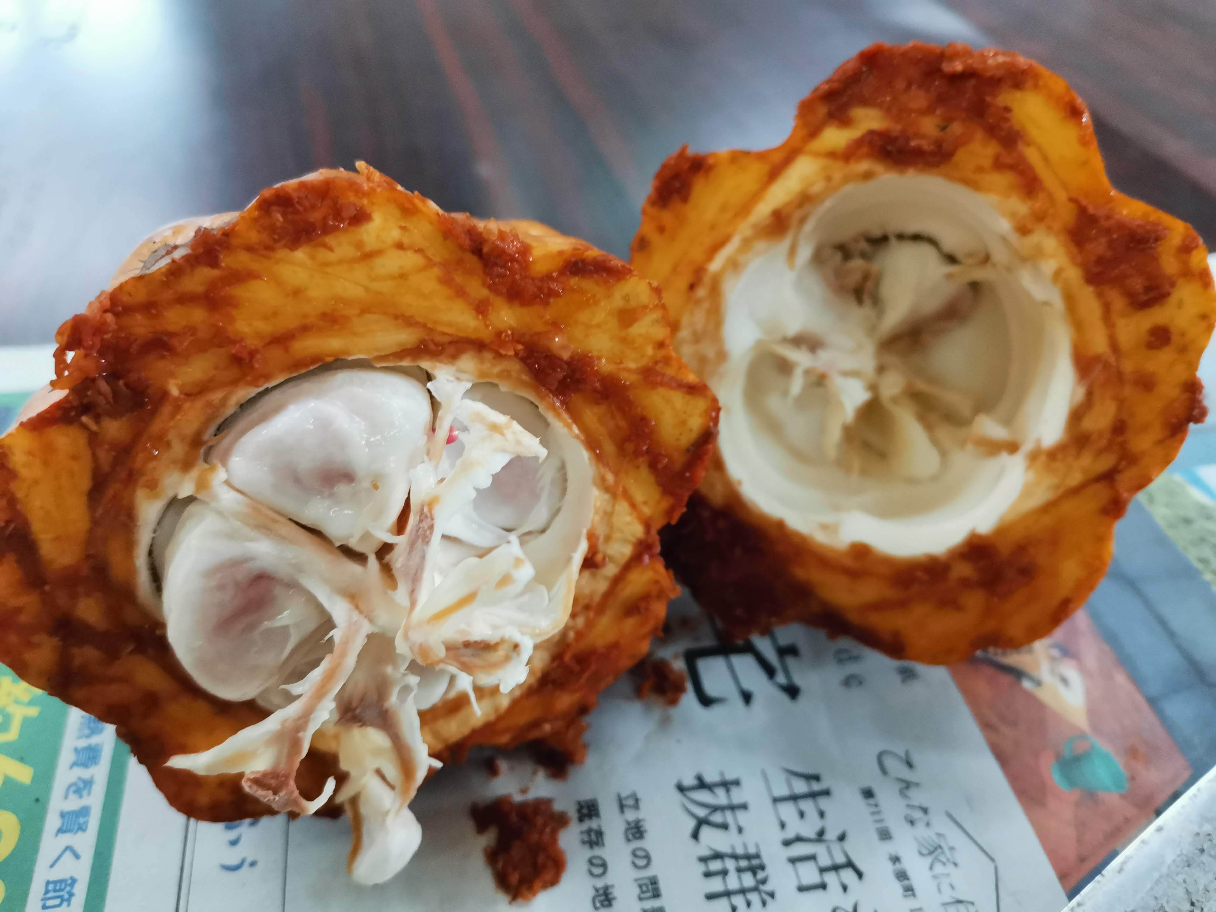 初めて収穫したカカオ。果皮は厚いけどカカオ豆(種)はしっかりと入っており、白い果肉は甘酸っぱく美味しい、まさにカカオでした。