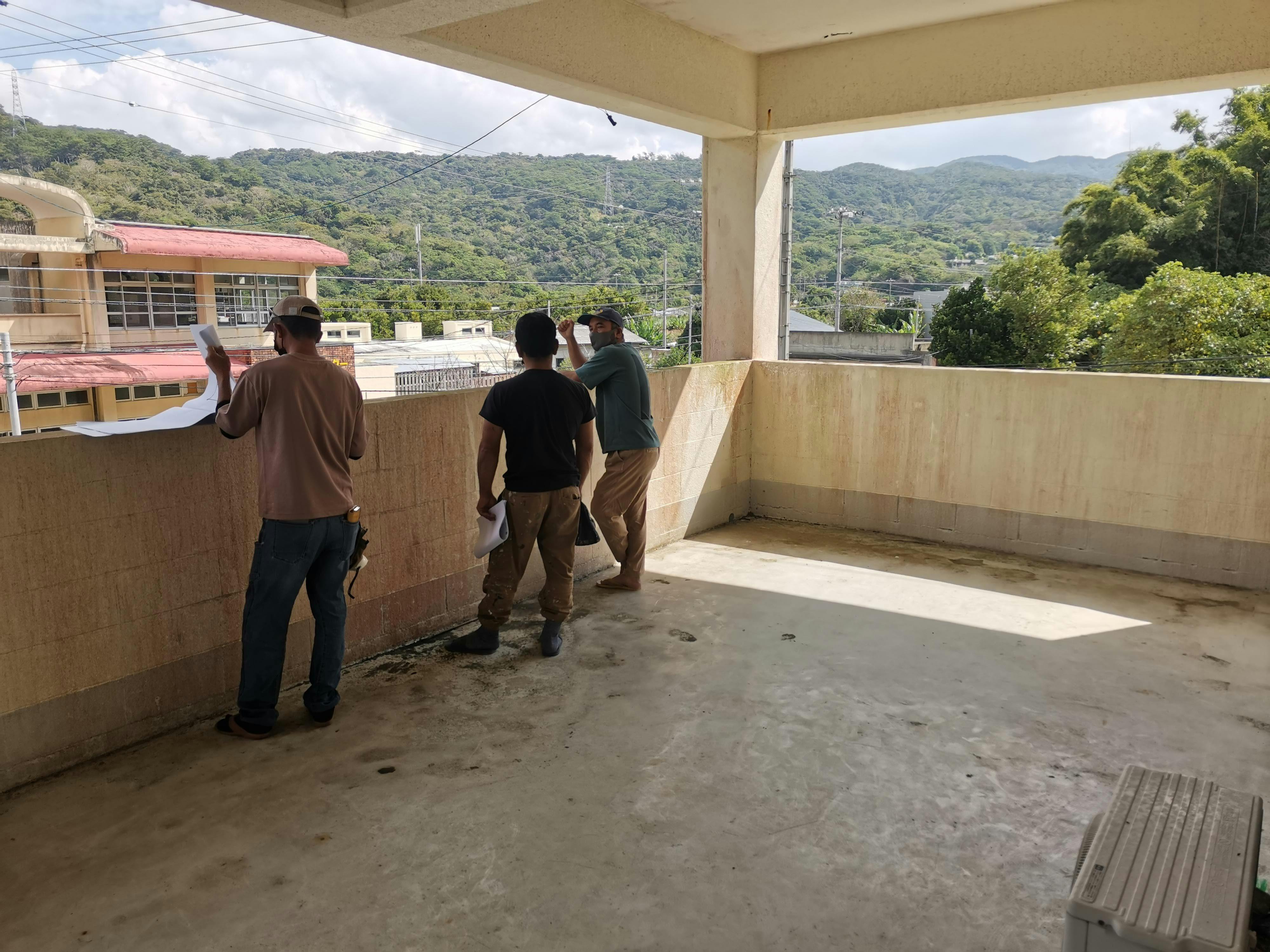 写真はカフェに改築する2Fベランダ部分での打ち合わせ風景。