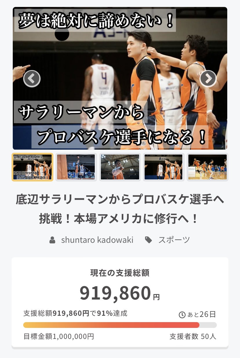 クラウドファンディングスタートから24時間ですが、既になんと90%を達成しました!多くのご支援をいただき本当にありがとうございます。最初の24時間で3割達成を目標にしていましたが、これもご協力頂いた皆さんのおかげです。目標達成とアメリカ挑戦、B1挑戦に向けてより一層頑張っていきます。これからも門脇駿太郎の活動の応援をよろしくお願いします。
