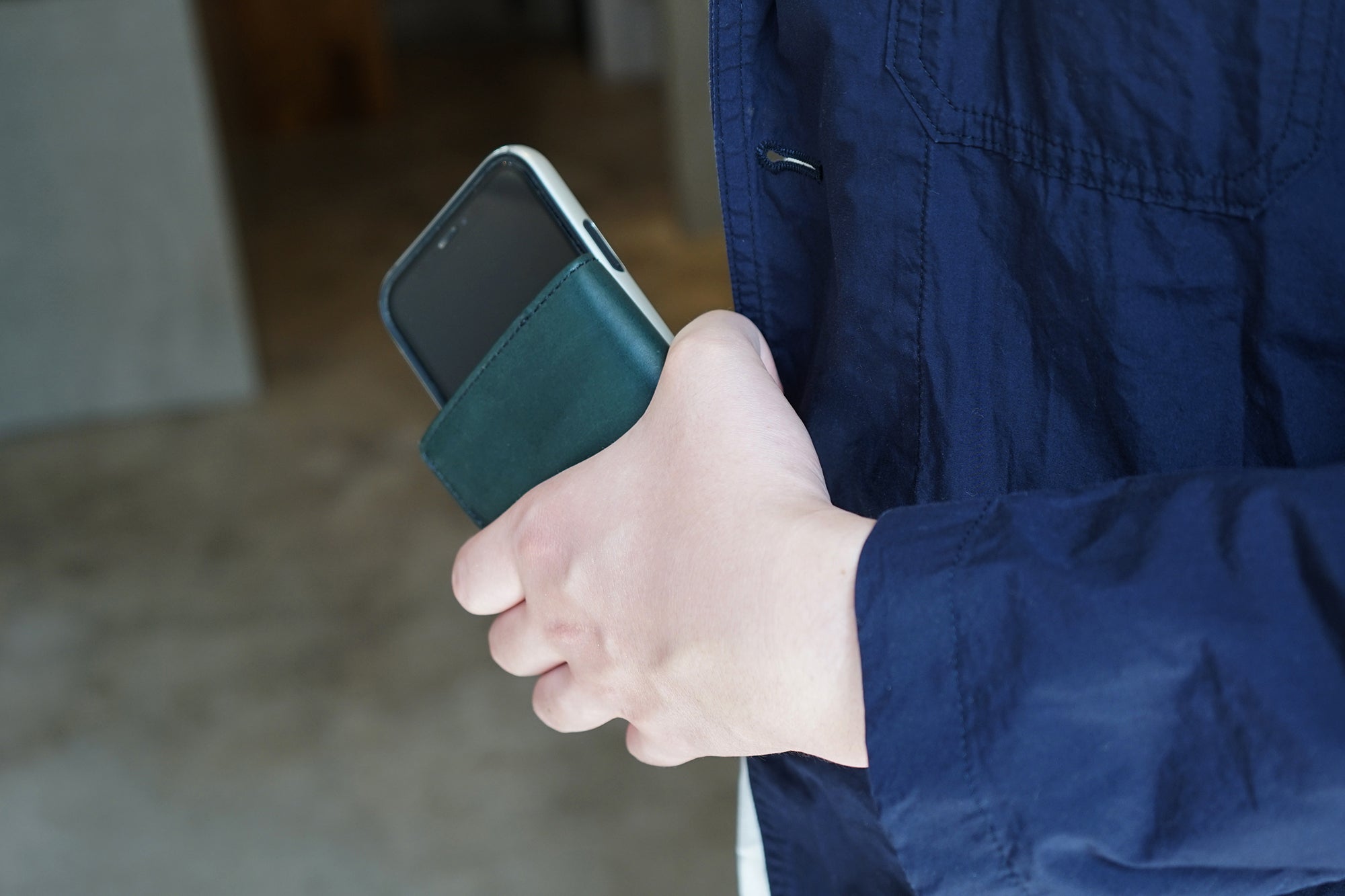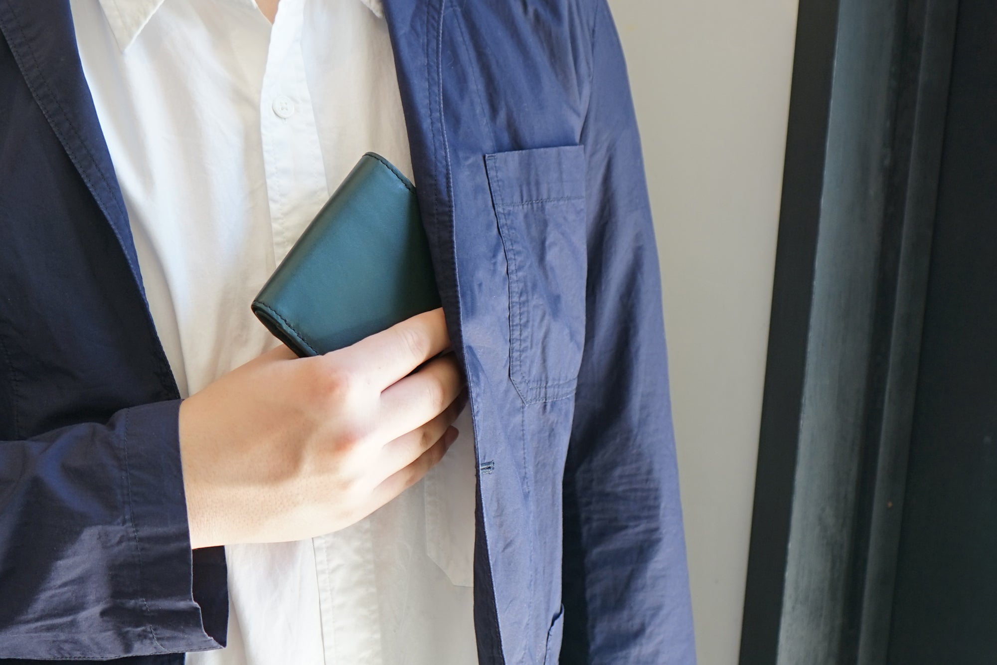 ジャケットの胸ポケットにもすっぽり収まるサイズ感で、薄マチなのでボッコリしません。