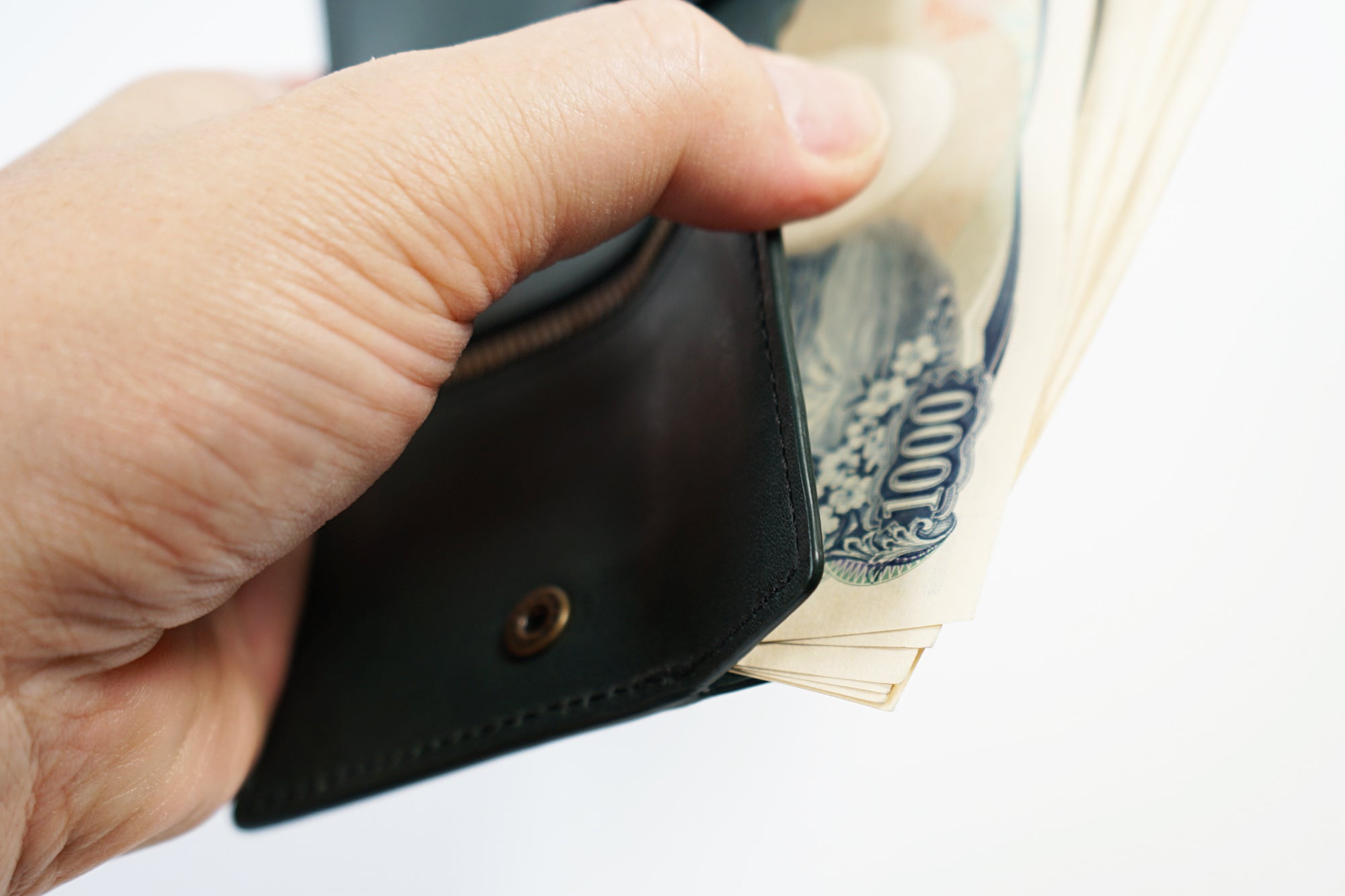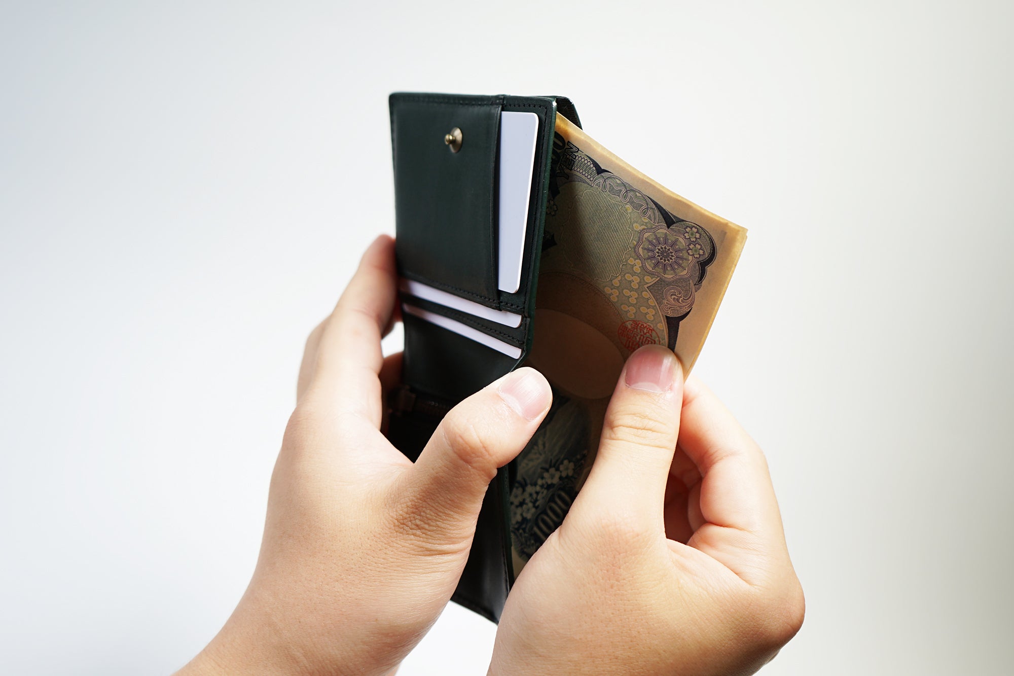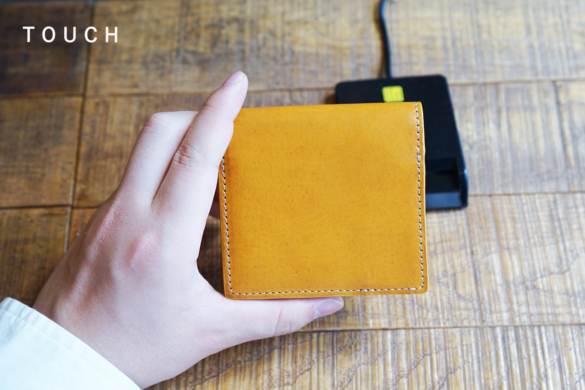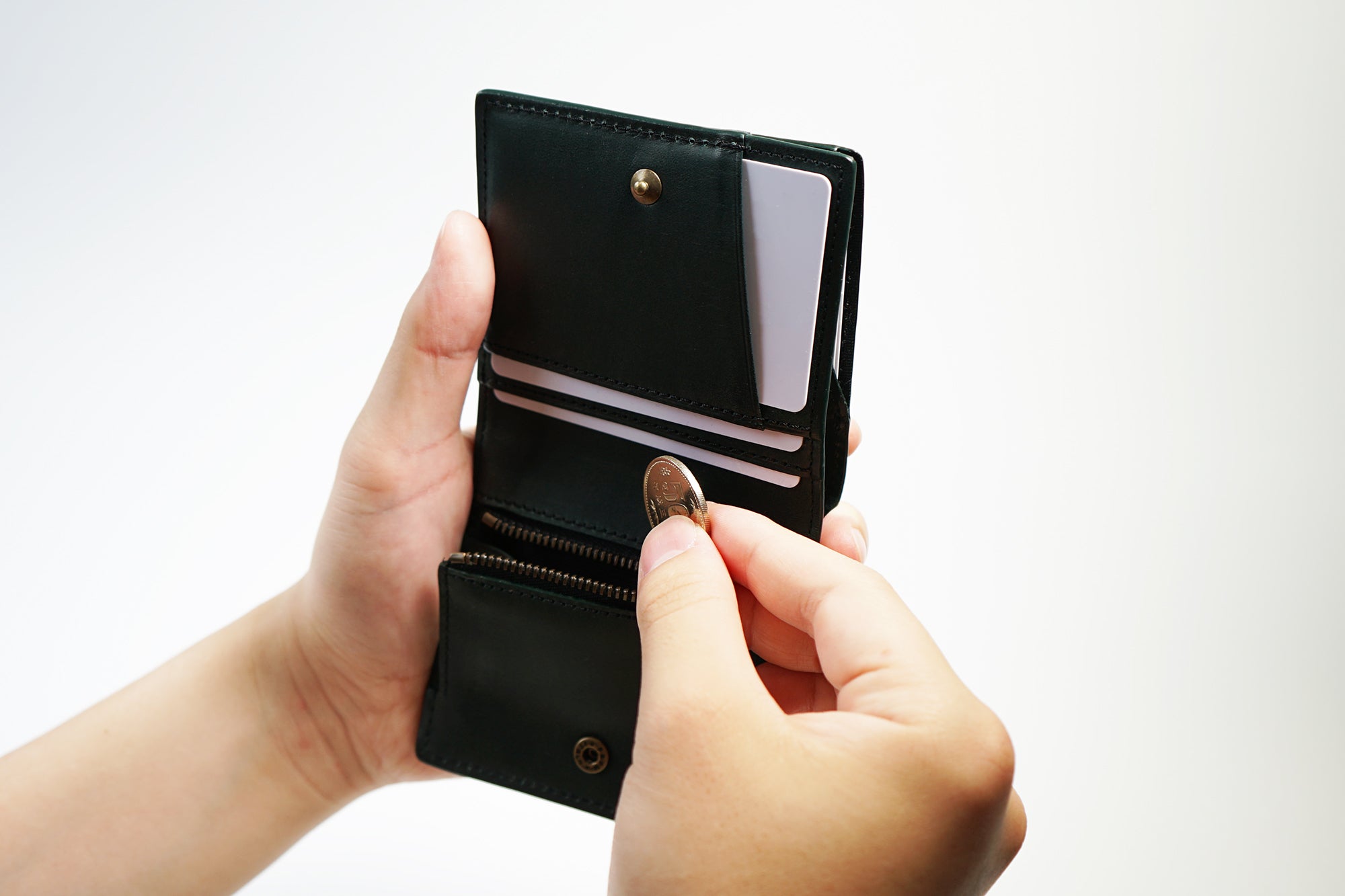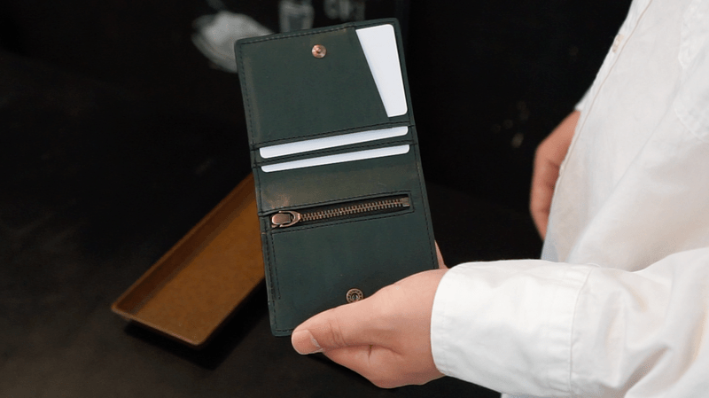 今、薄い財布が多く出ていますが、コインスペースとカードスペースをずらして薄くしています。そうすると、タテに長くなり、握ることはできません。さらに小銭入れはとても小さく、急いでいたり意識していないと、こぼれてしまいます。一番大切なお支払い時にいかにクイックでスマートかを大切に考えています。
