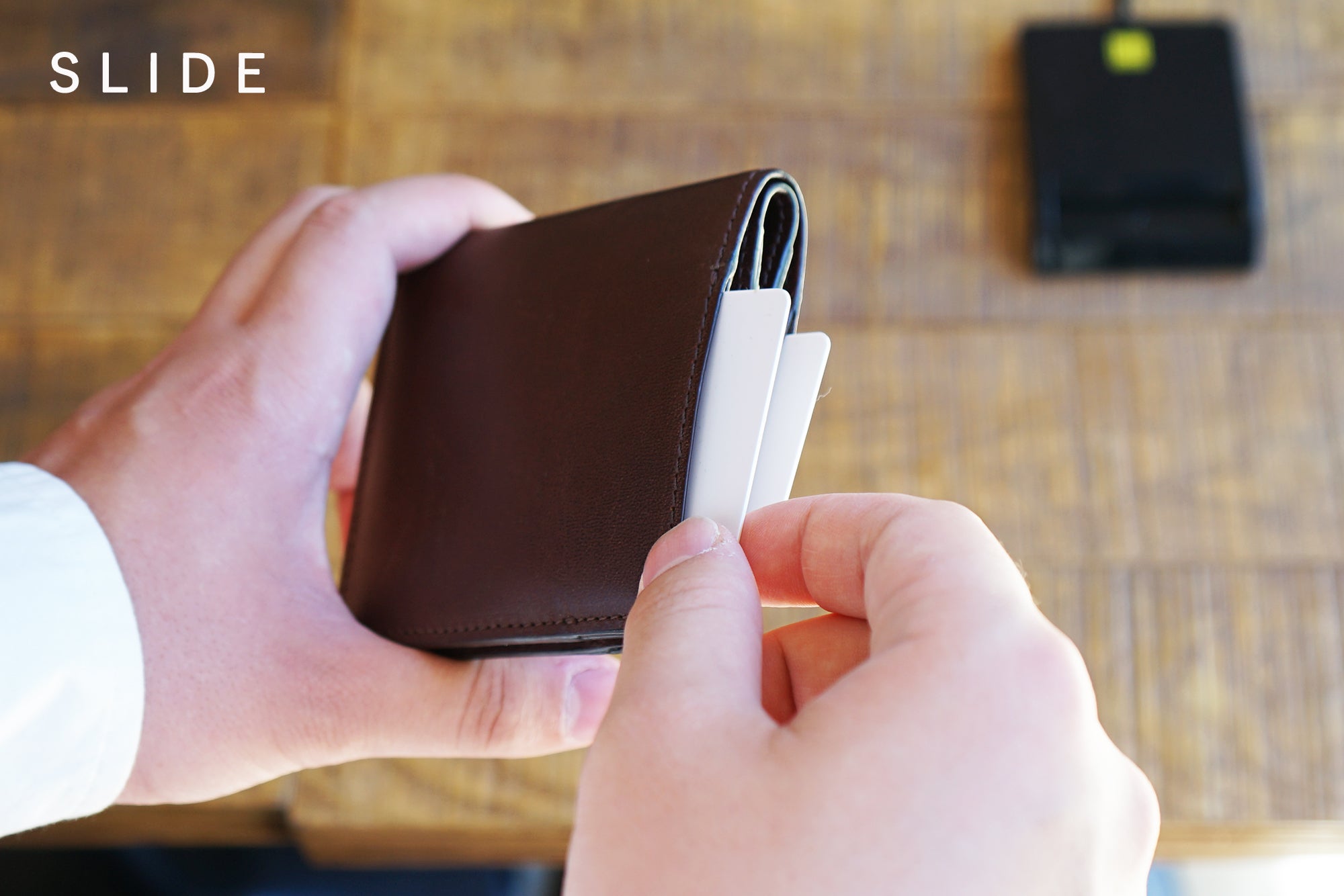 財布を開くことなく瞬時にカードをスライドして取り出して、差し込みタイプのカードリーダーに、瞬時に対応することが可能です。