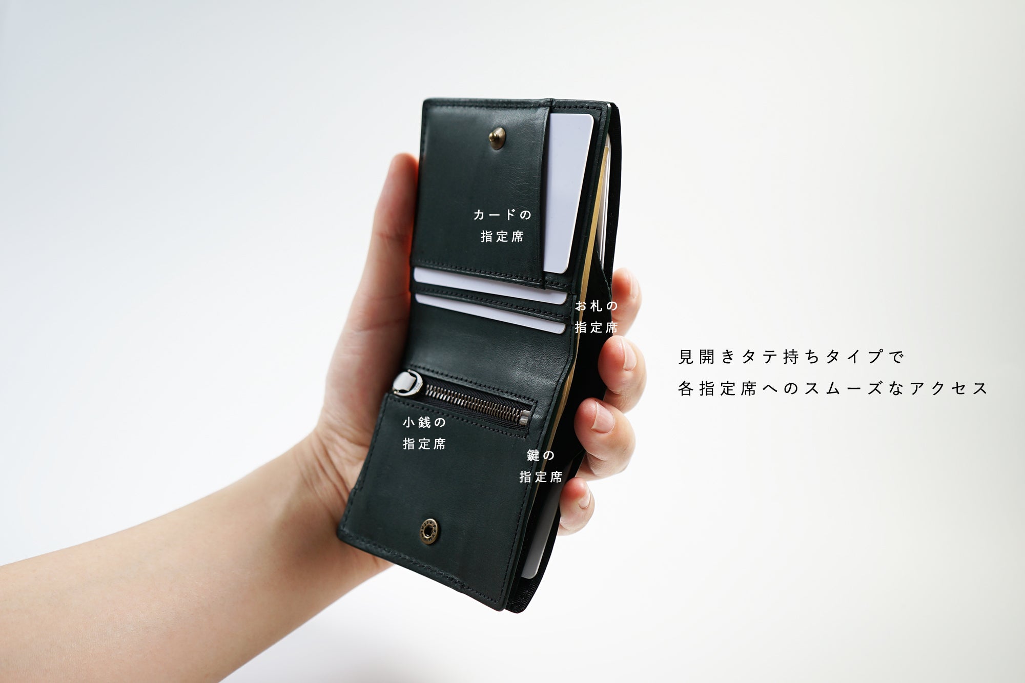 ●一瞬で展開する2つ折りタイプで、カード段を設け、3枚のレギュラーカードがすぐ見渡せて、素早く取り出し可能