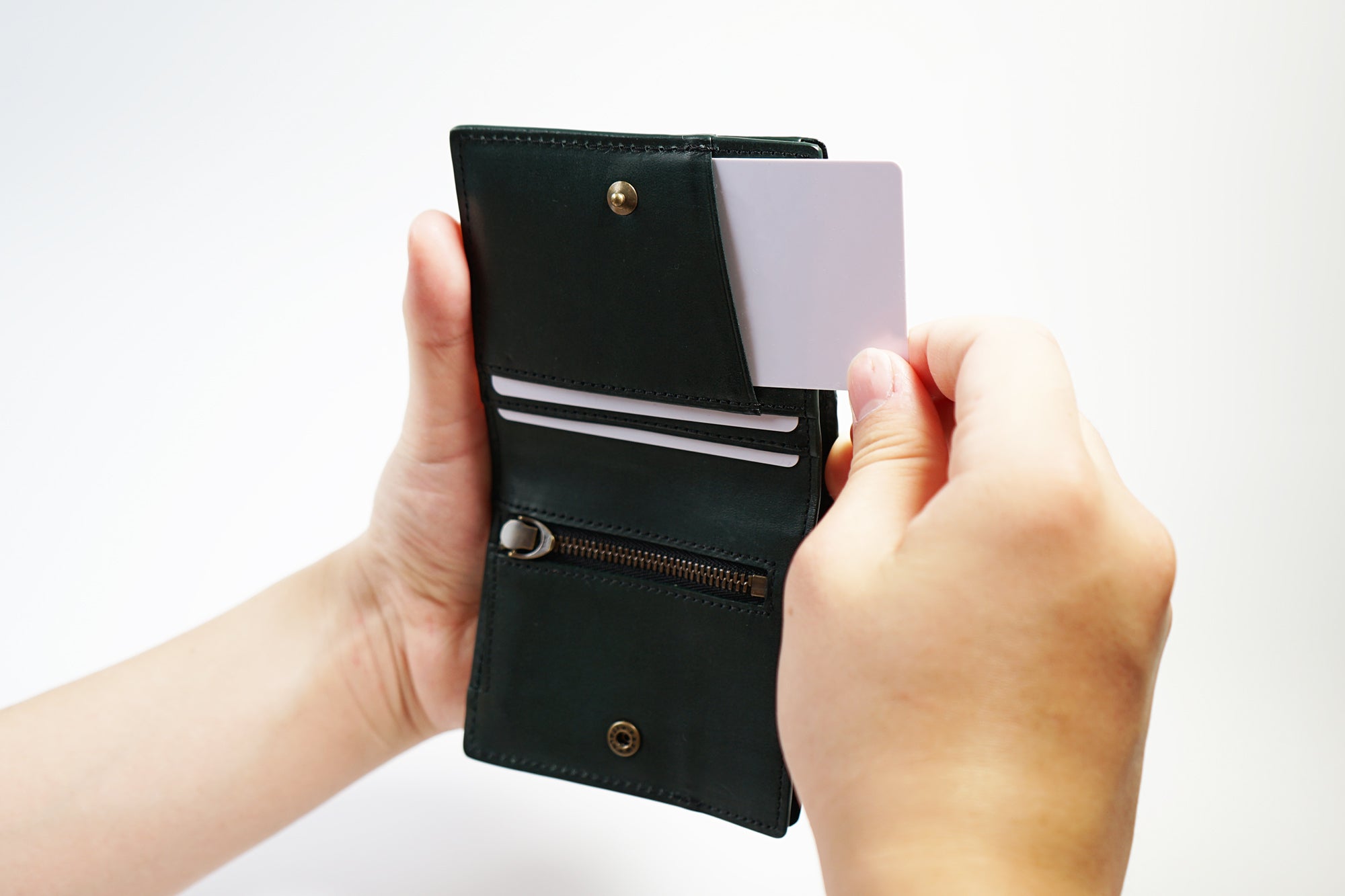 財布を開くことなく瞬時にカードをスライドして取り出せます。