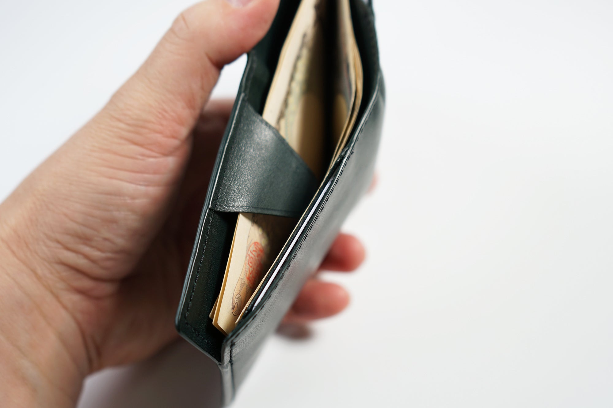 (多くの薄い財布は薄さを追求するあまり、革自体を薄くしていますが、革が薄すぎると耐久性や質感が損なわれ、永くエイジングを楽しみがら共に過ごせなくなりますので、革は絶妙な厚みで調整しています。)