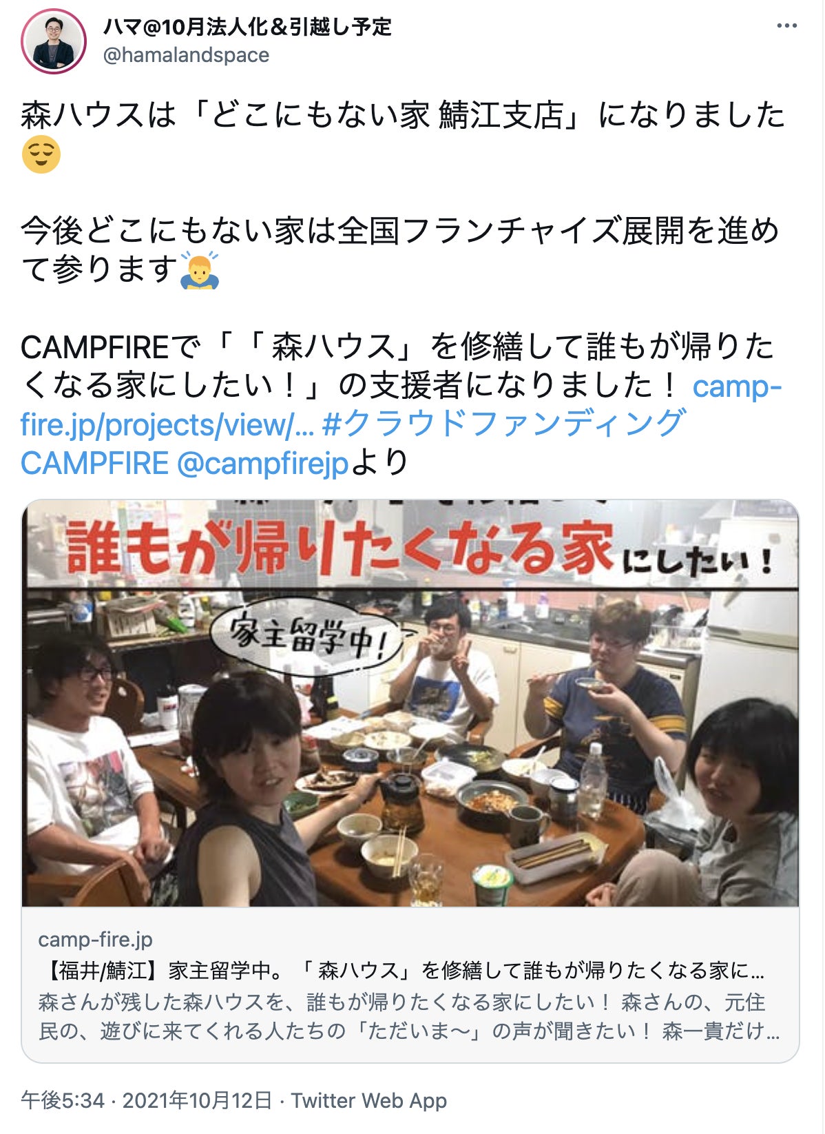 昨日、知人のハマさんがリターンの「森ハウス命名権」を支援してくださいました。これにより森ハウスは、「どこにもない家 鯖江支店」となります。これからなにが起きるのか楽しみです!