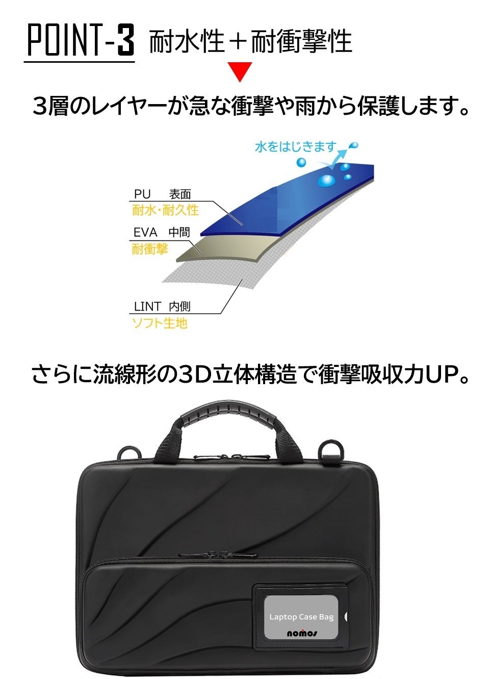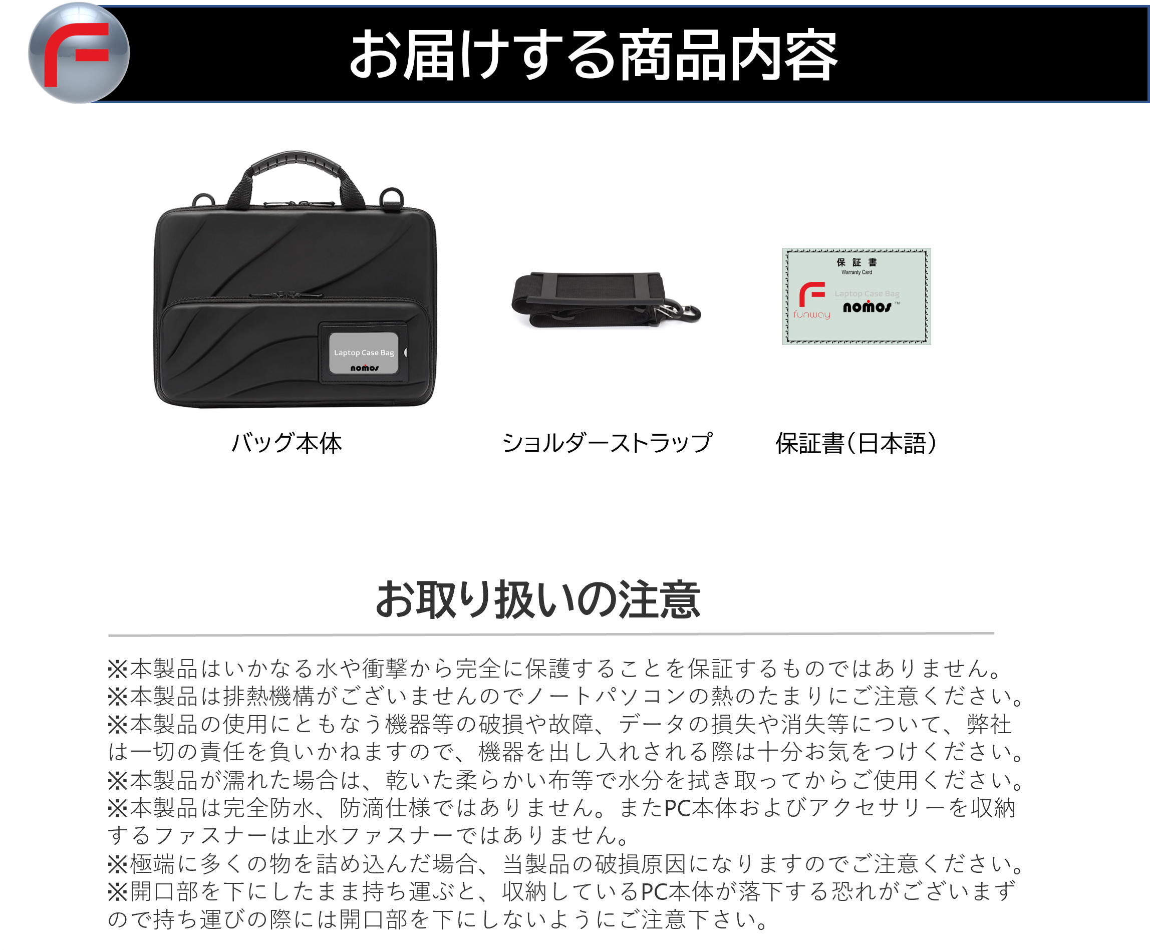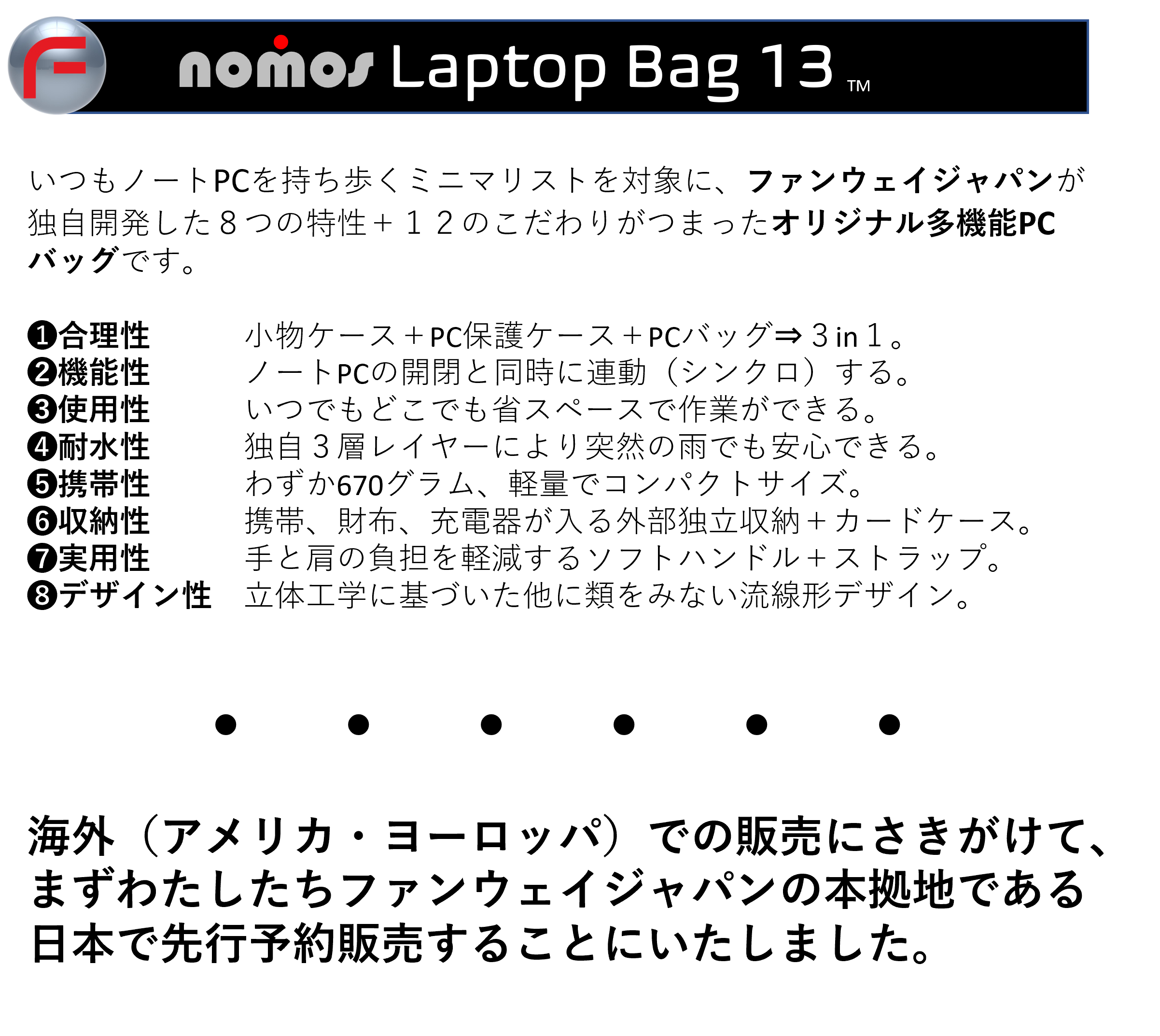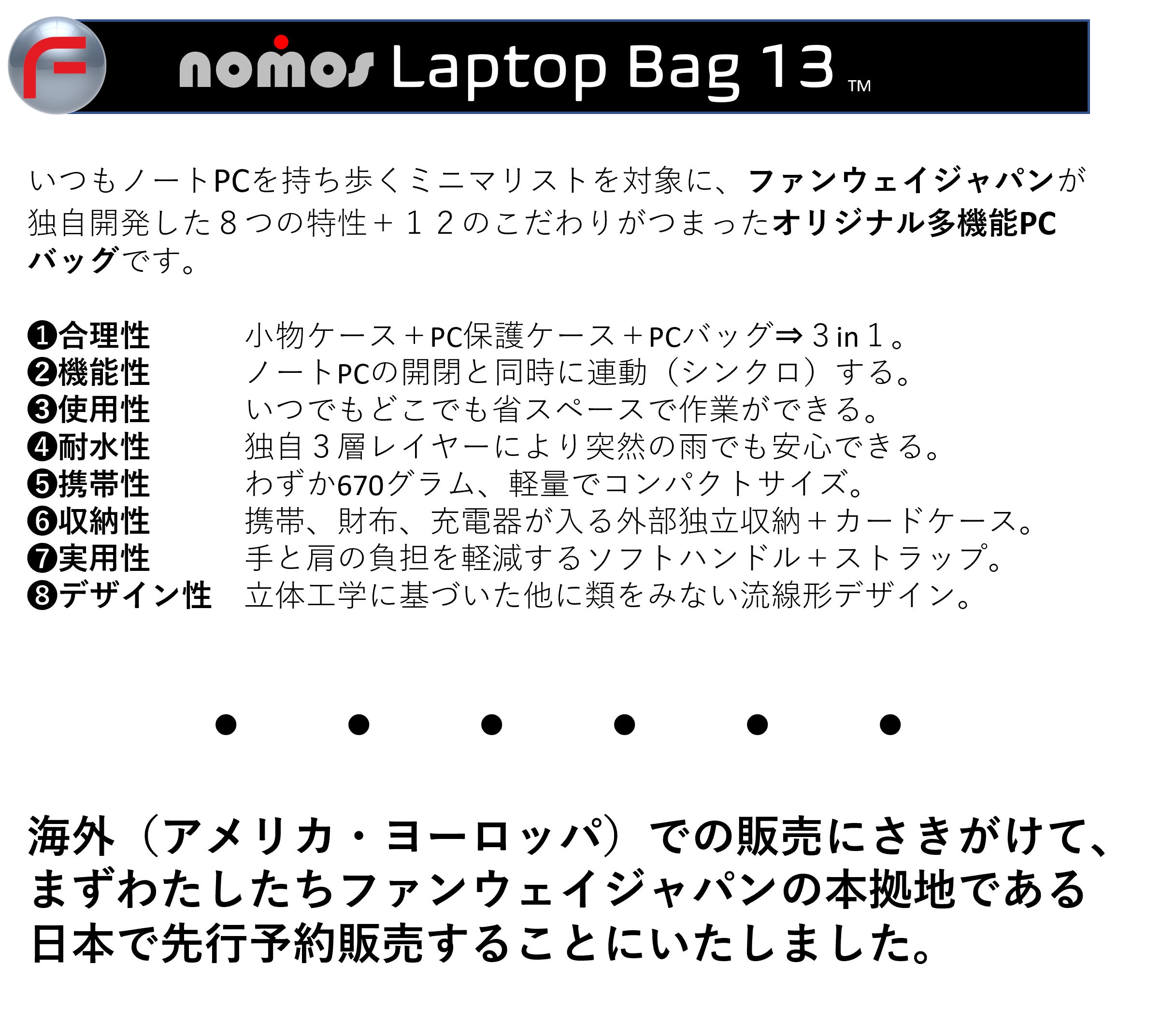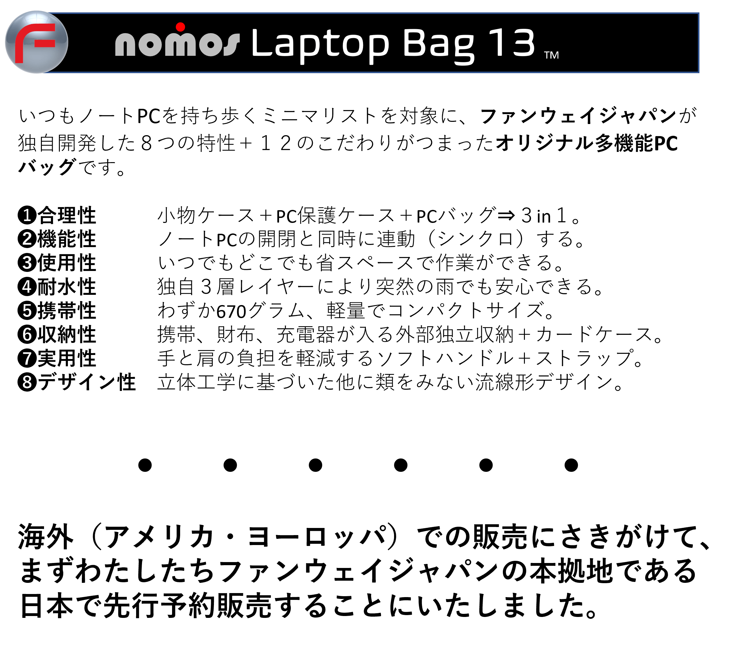 nomos(ノモス)は、ファンウェイジャパン、ガジェットプロダクトのブランドネームです。コンパクト(MacBook 13対応)、700グラム以下、耐水、耐衝撃、内部の防キズ素材、シンクロ開閉機能、独立した小物入れ(財布、携帯、チャージャー、リップが入る容量)、手提げ+ショルダー、スタイリッシュなデザイン、これらすべてプロジェクトスタート時点で妥協できない条件でした。