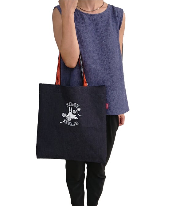 今回のクラウドファンディングのために作りました、限定柄の倉敷屋のデニムバッグです。