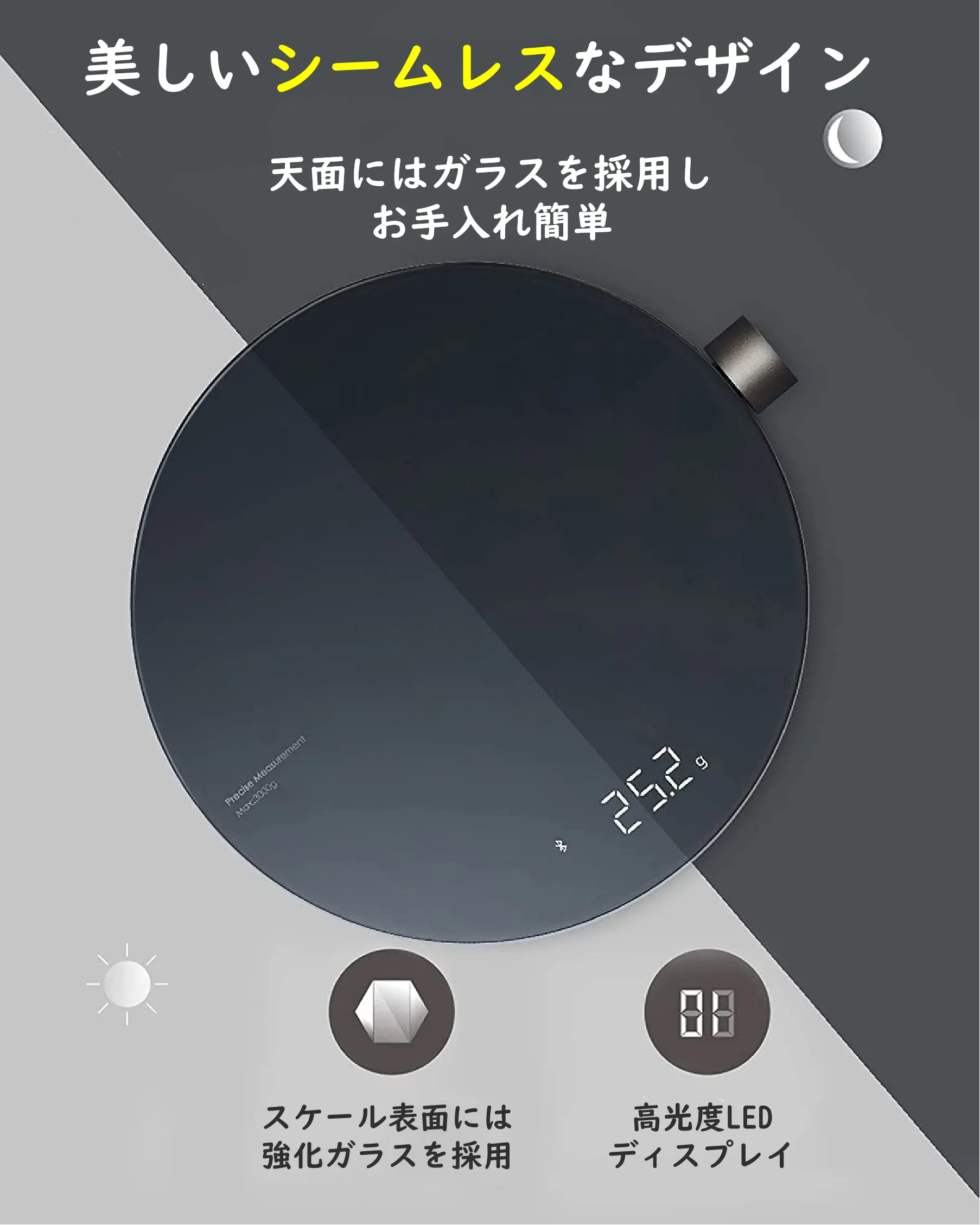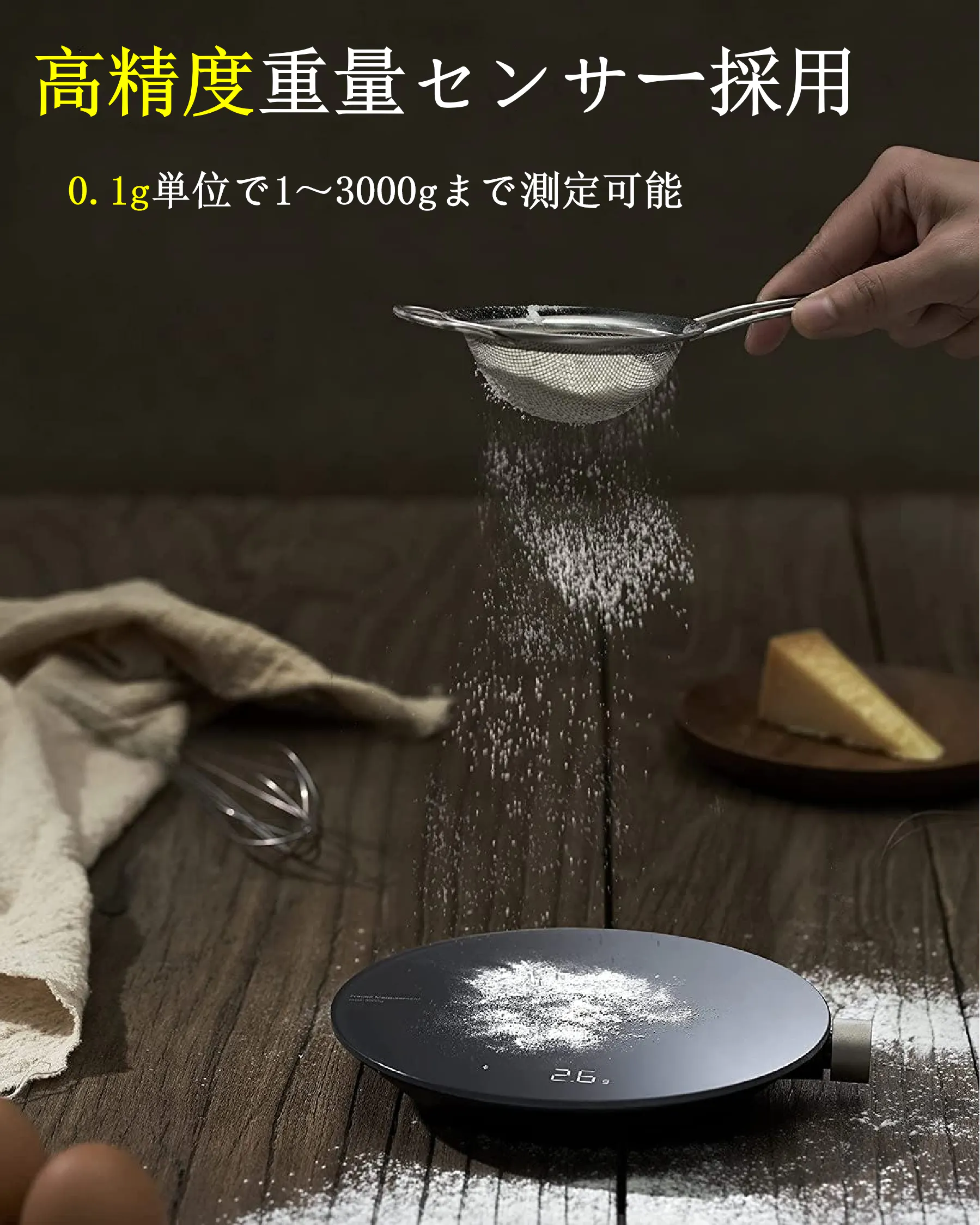 ・高精度:HOTO フードスケールは、超高精度の重量センサーを搭載しており、測定結果を一瞬で表示可能。0.1g単位で1g~3000gまでの測定が行えます。