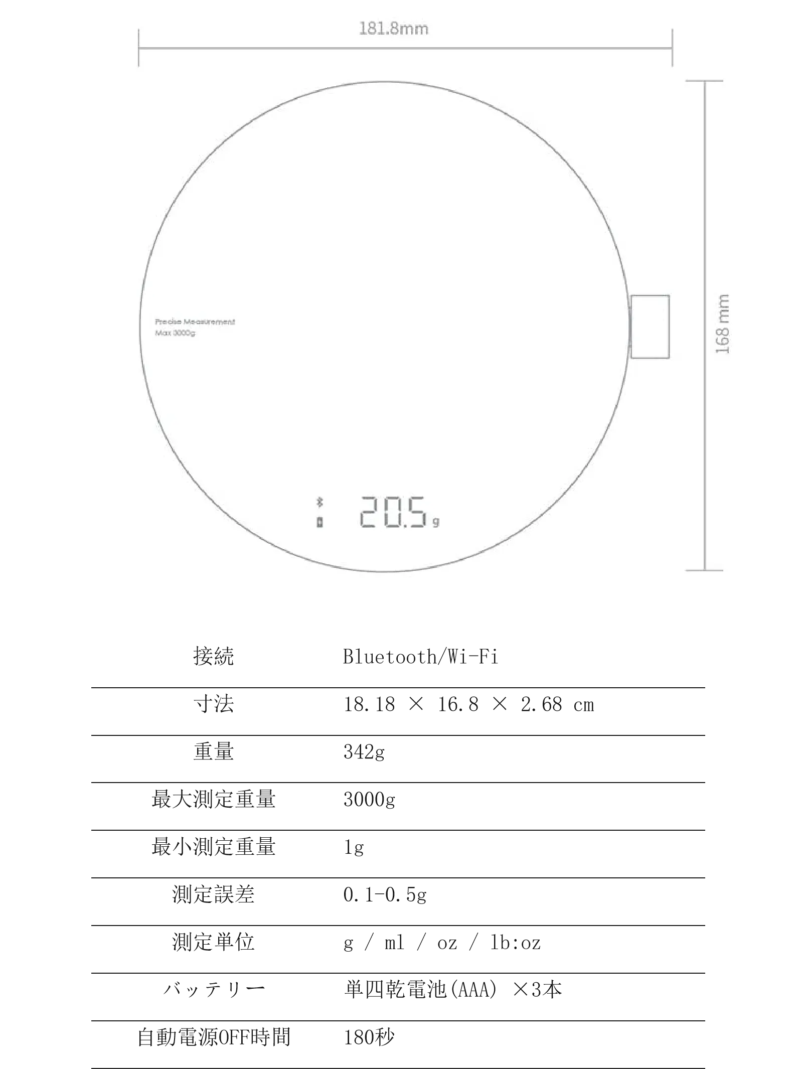 計量範囲は1g-3000g。精度0.1g単位 (1000gまで)で、リアルタイムに計量できます。