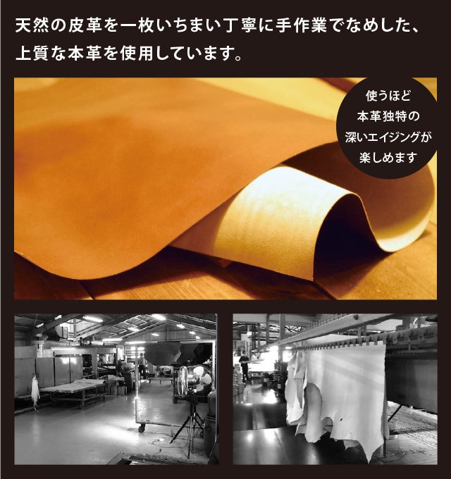 「皮」から「革」にすることを「鞣し(なめし)」といいます。このように「鞣し(なめし)」は 革製品の製造における大切な工程のひとつであり、革の特徴を左右する重要な作業です。この工程も「MADE IN JAPAN」にこだわります。