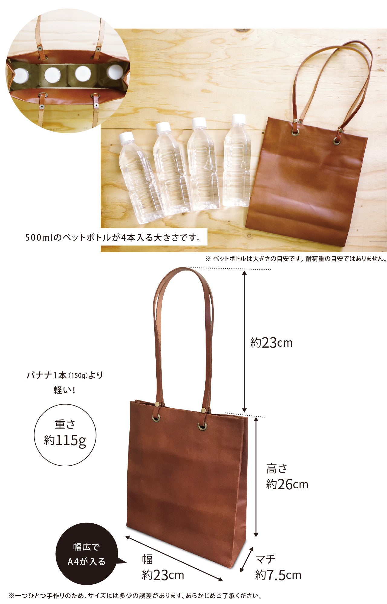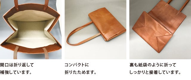 ※紙袋のような軽さを実現するため、極力縫製を減らし、一枚の革を接着加工による張り合せでバッグを軽量化しています。