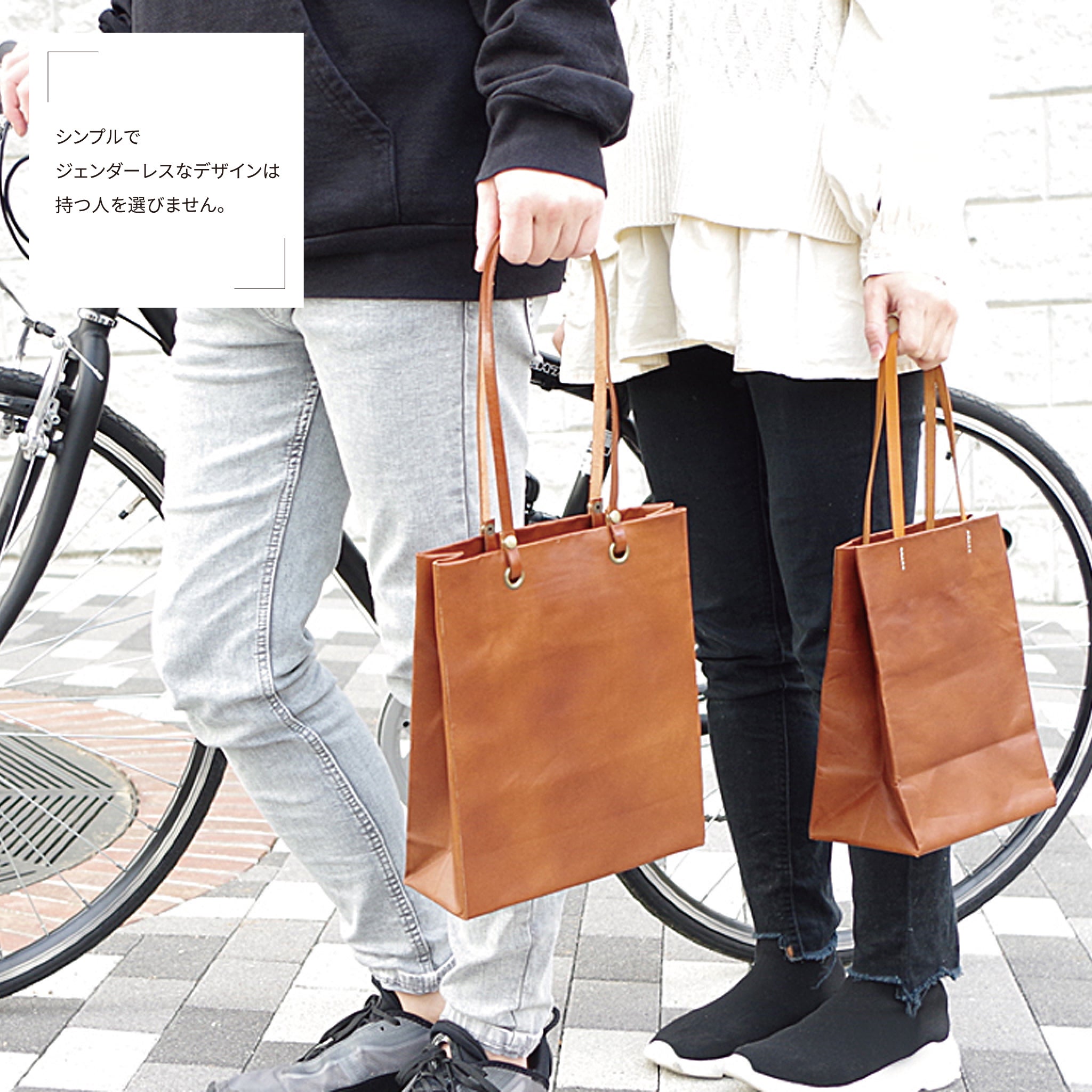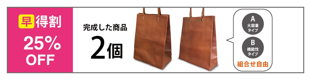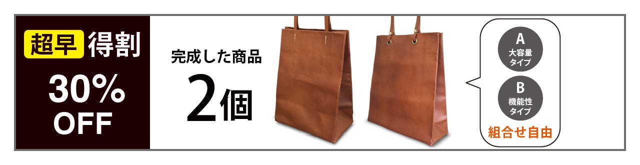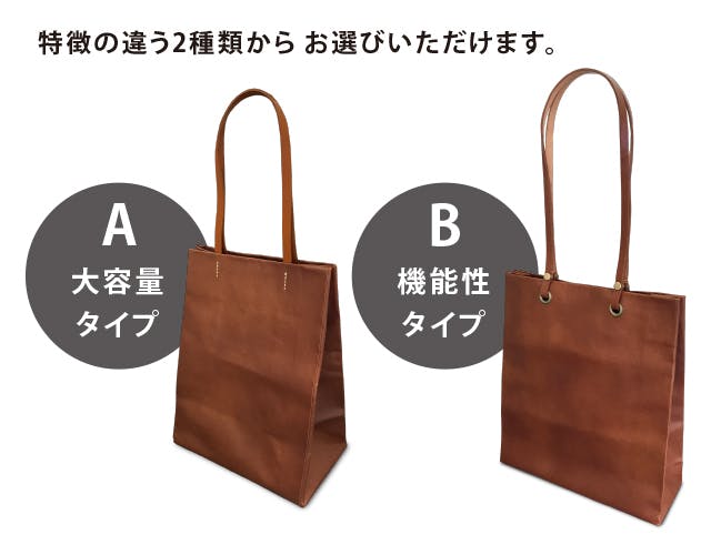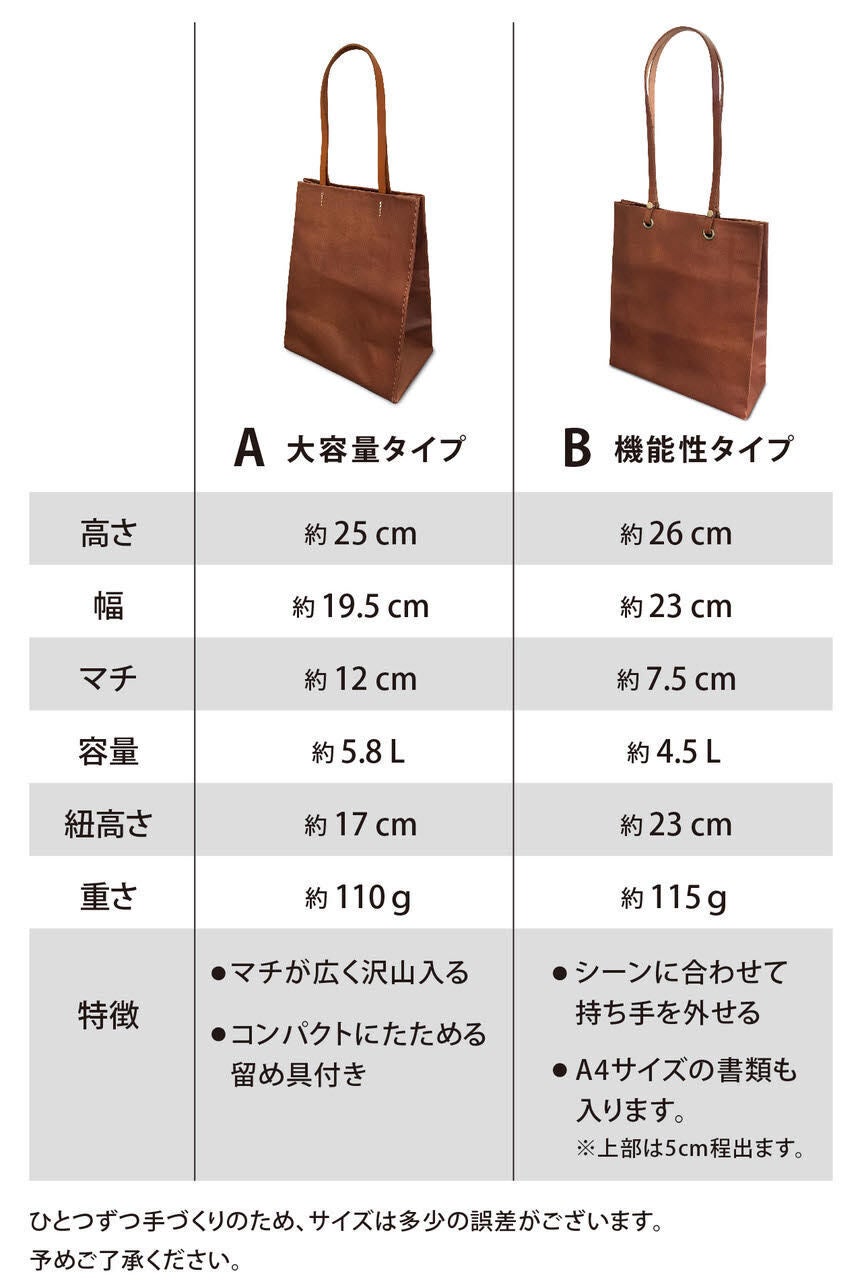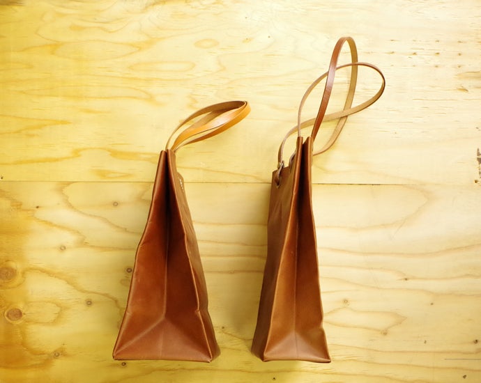 紙袋のような使い勝手のよさを「皮革」素材で実現させたコンパクトサイズのバッグです。 鞄のような重厚感はありませんが、永く愛用できるように、またライフスタイルにも合うように2種類のデザインをご用意しました。いずれも飽きの来ないシンプルなデザインです。