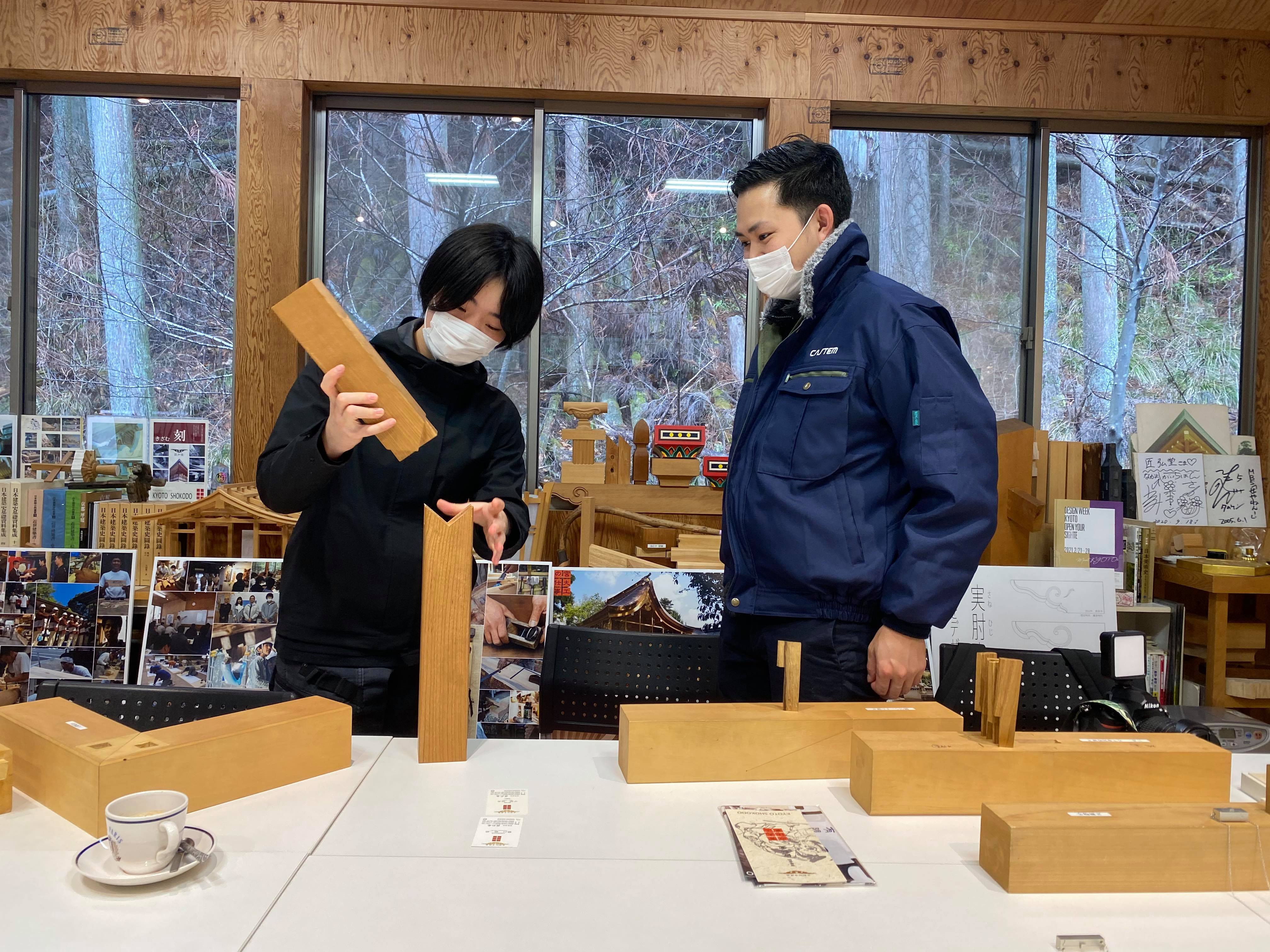 匠弘堂にて実際に継手のサンプルに触る京都LiQスタッフ