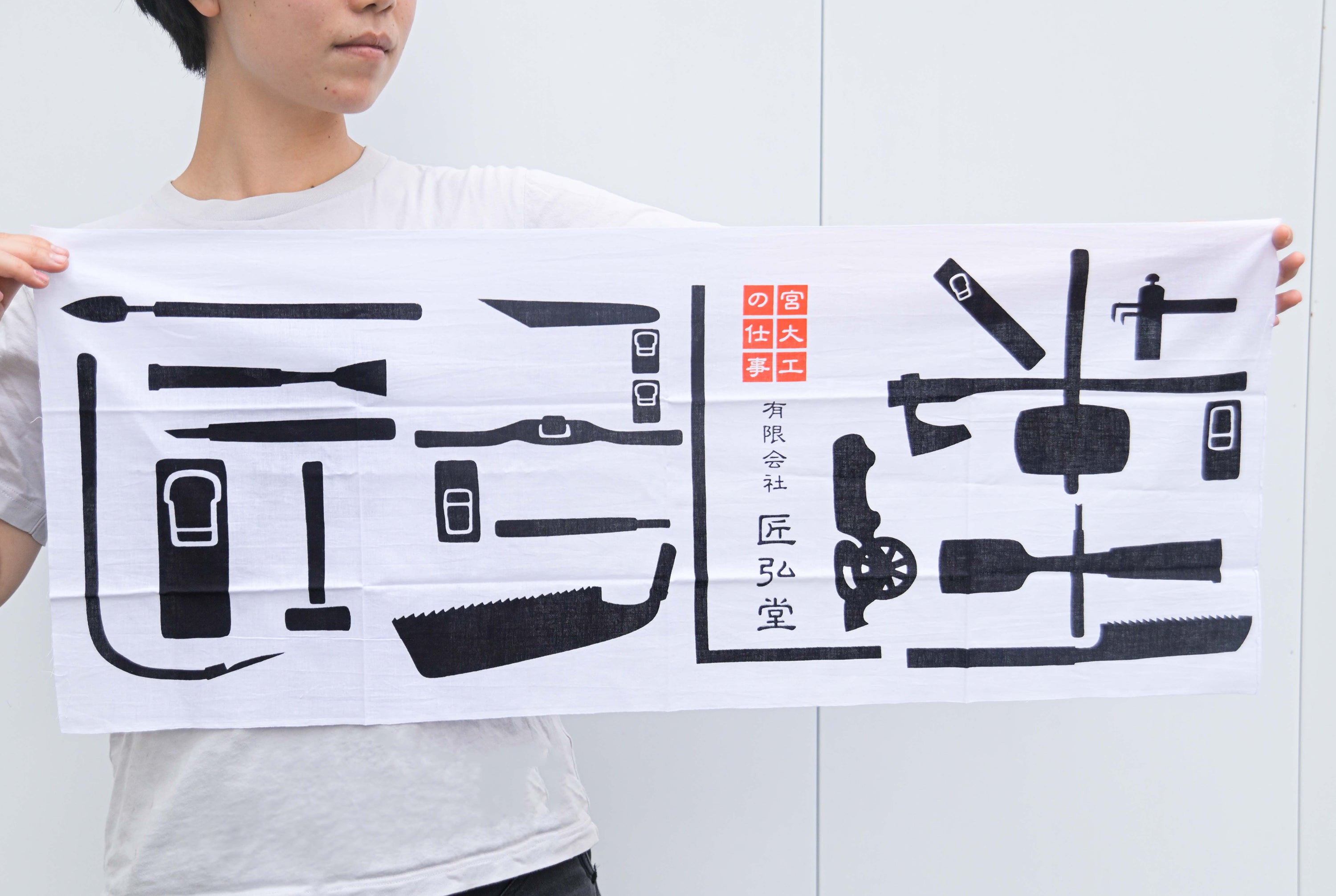 木綿製の手拭いにはたくさんの大工道具が図柄になっており「匠弘堂」の文字を作り上げています。