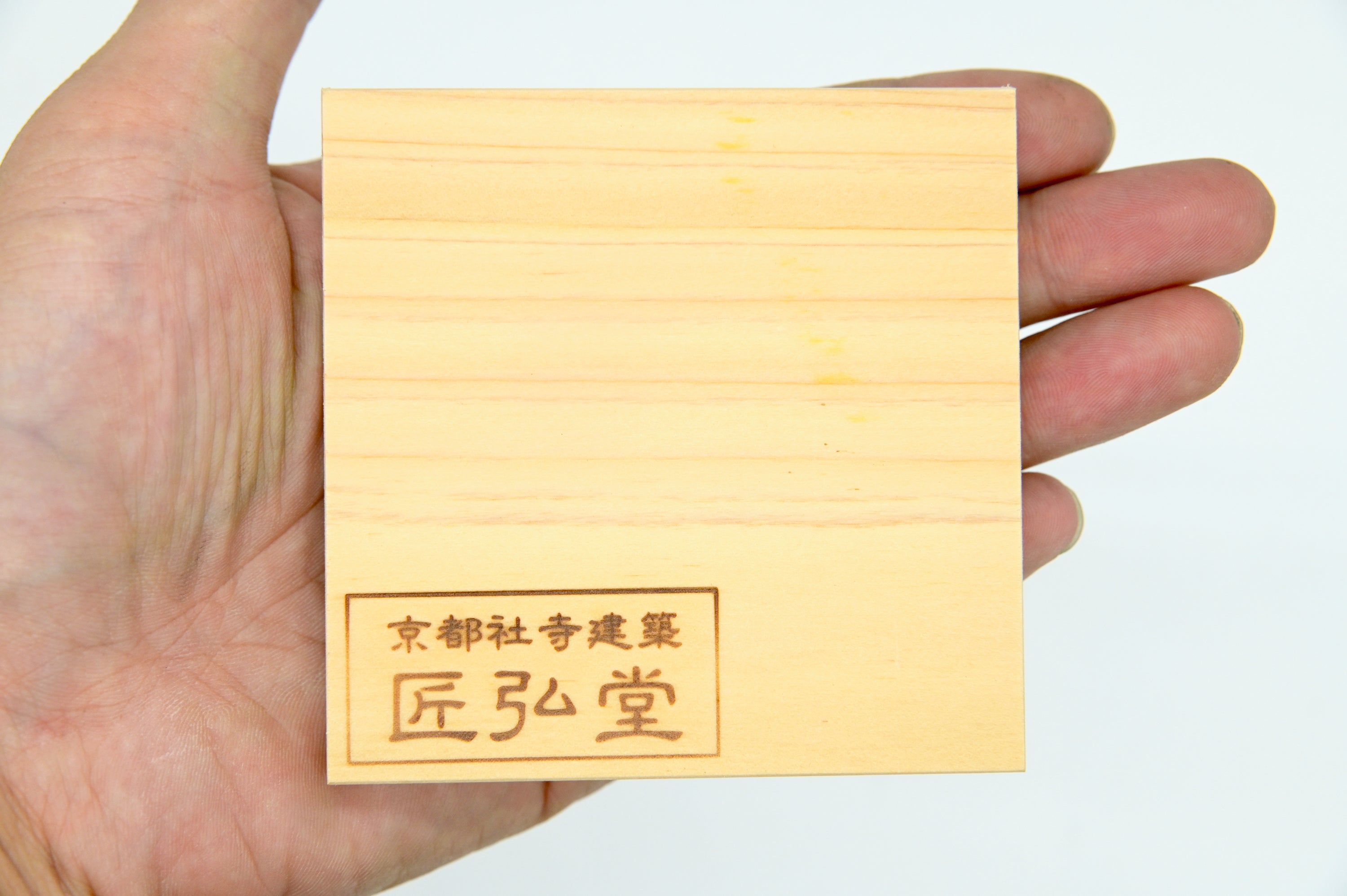コースターは匠弘堂の焼印入り。檜の香りを楽しめるコースターとなっております。